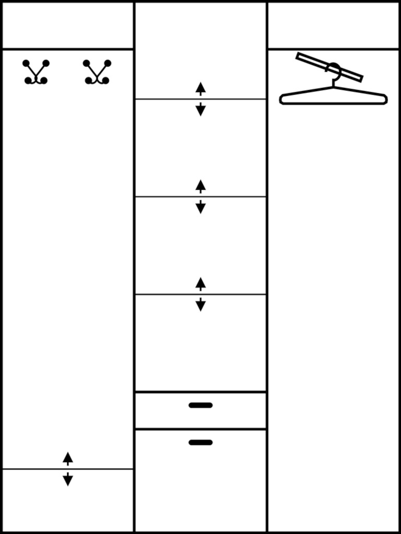 Předsíňová skříň Alexander 4 bez zrcadla má moderní design a díky praktickému úložnému prostoru je vhodným doplňkem do každého interiéru. Má výškově nastavitelné police. Předsíňová skříň je vyrobena z 16 mm lamina, na výběr z několika barevných variant. Vnitřní vybavení skříně viz obrázek.