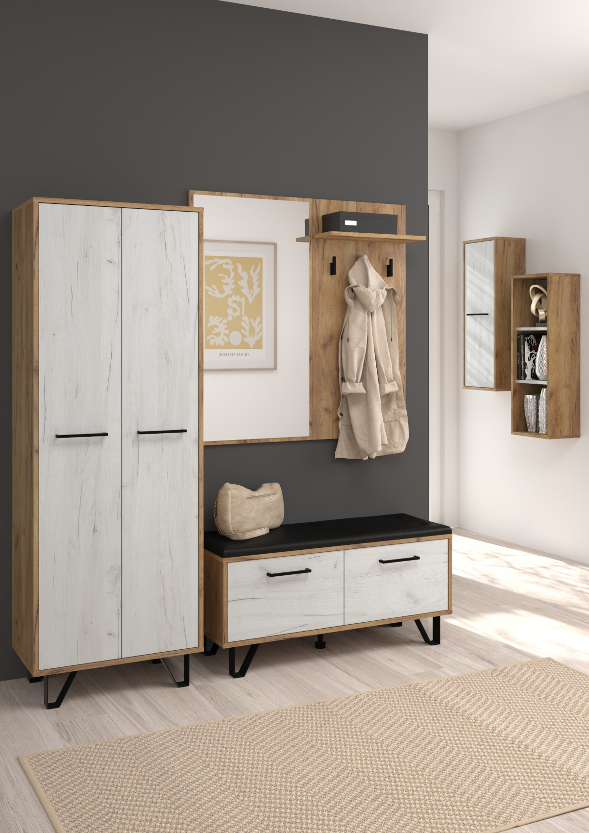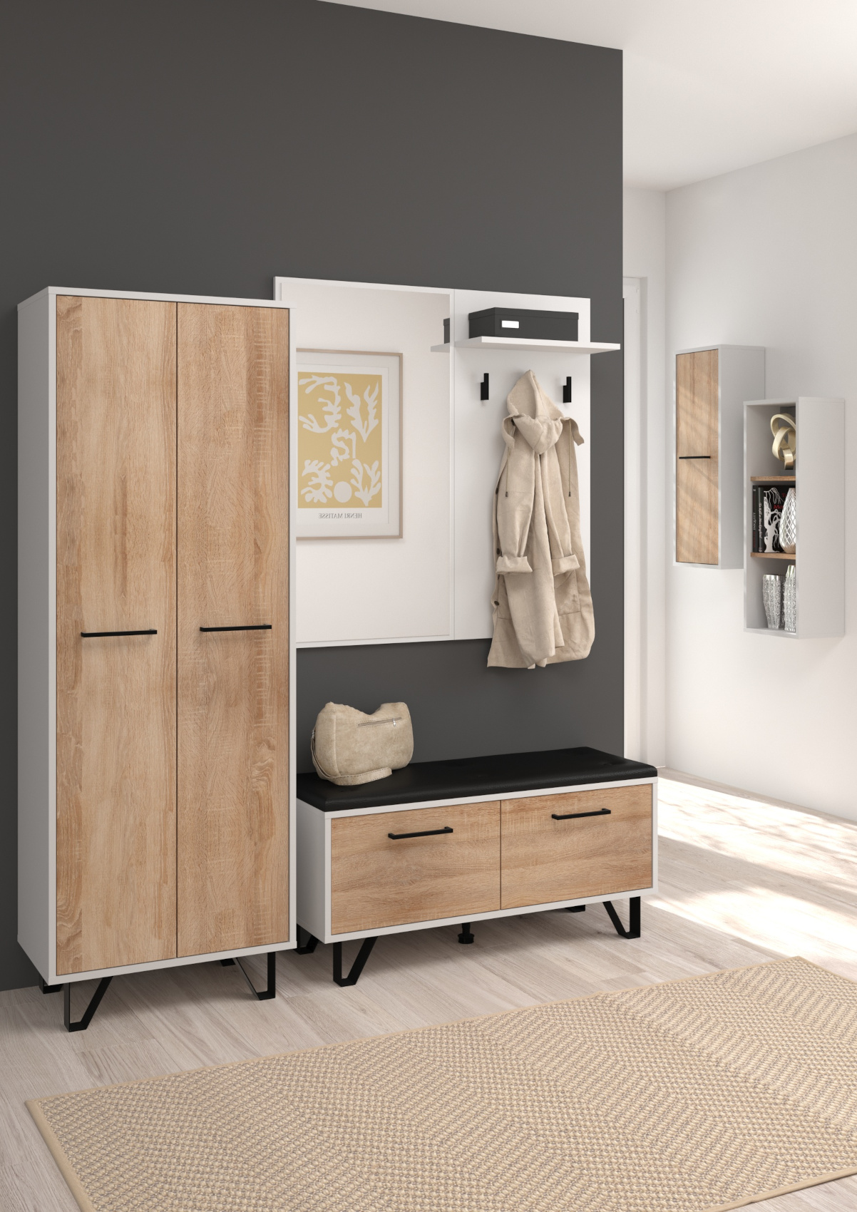 Předsíň Boss vás zaujme svým moderním elegantním designem a barevným provedením s přírodními detaily. Jednotlivé komodity jsou vyrobeny z kvalitních lamino desek o síle 16 mm. Desky mají ABS hranění, které zvyšuje odolnost pro odštípnutí hran. Součástí zásuvek a dvířek jsou jednoduché kovové úchyty a zároveň mají zabudovaný systém tichého dovírání. Nábytek stojí na kovových nožkách, které provzdušní váš interiér. Nabízíme vám několik barevných variant.