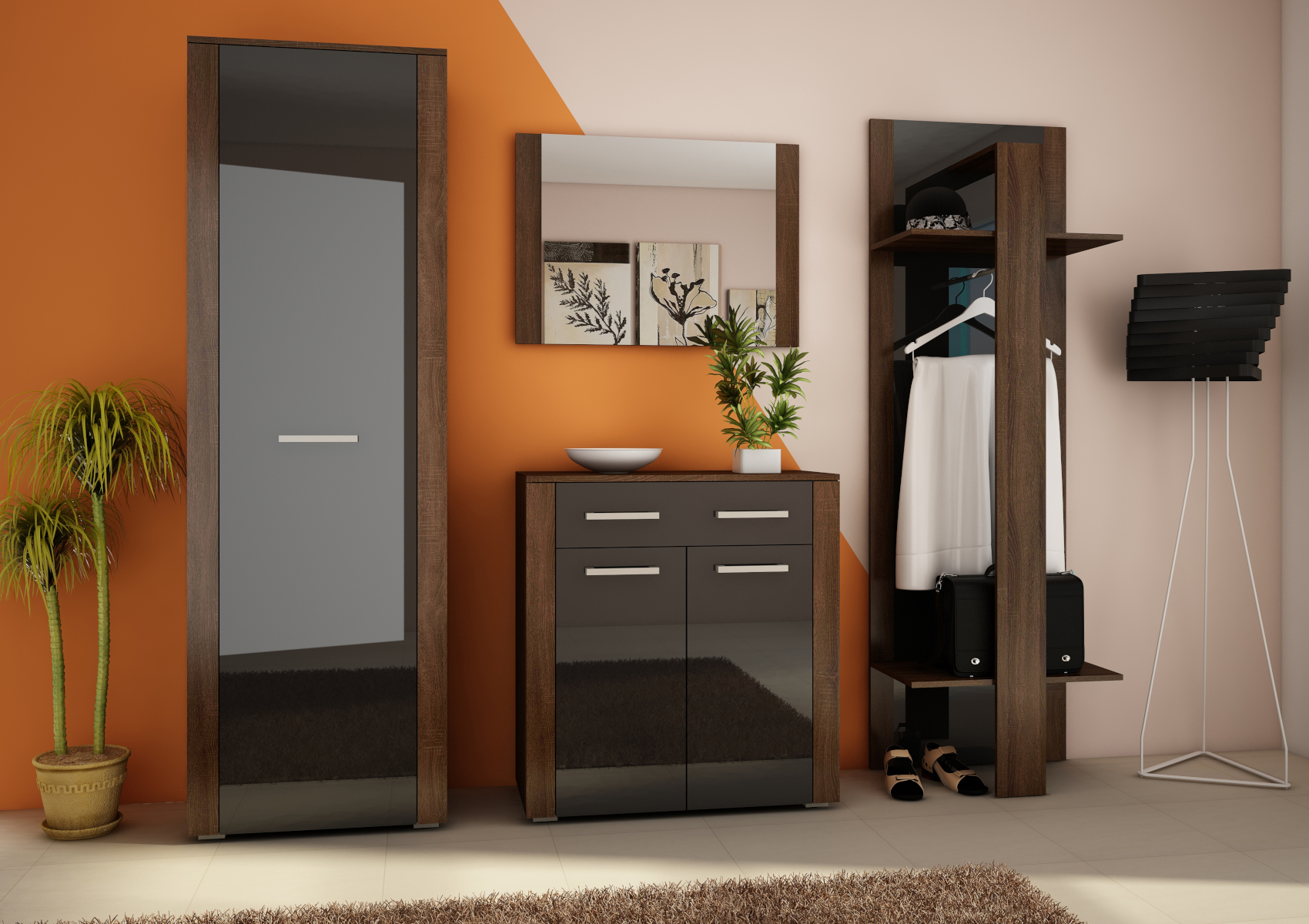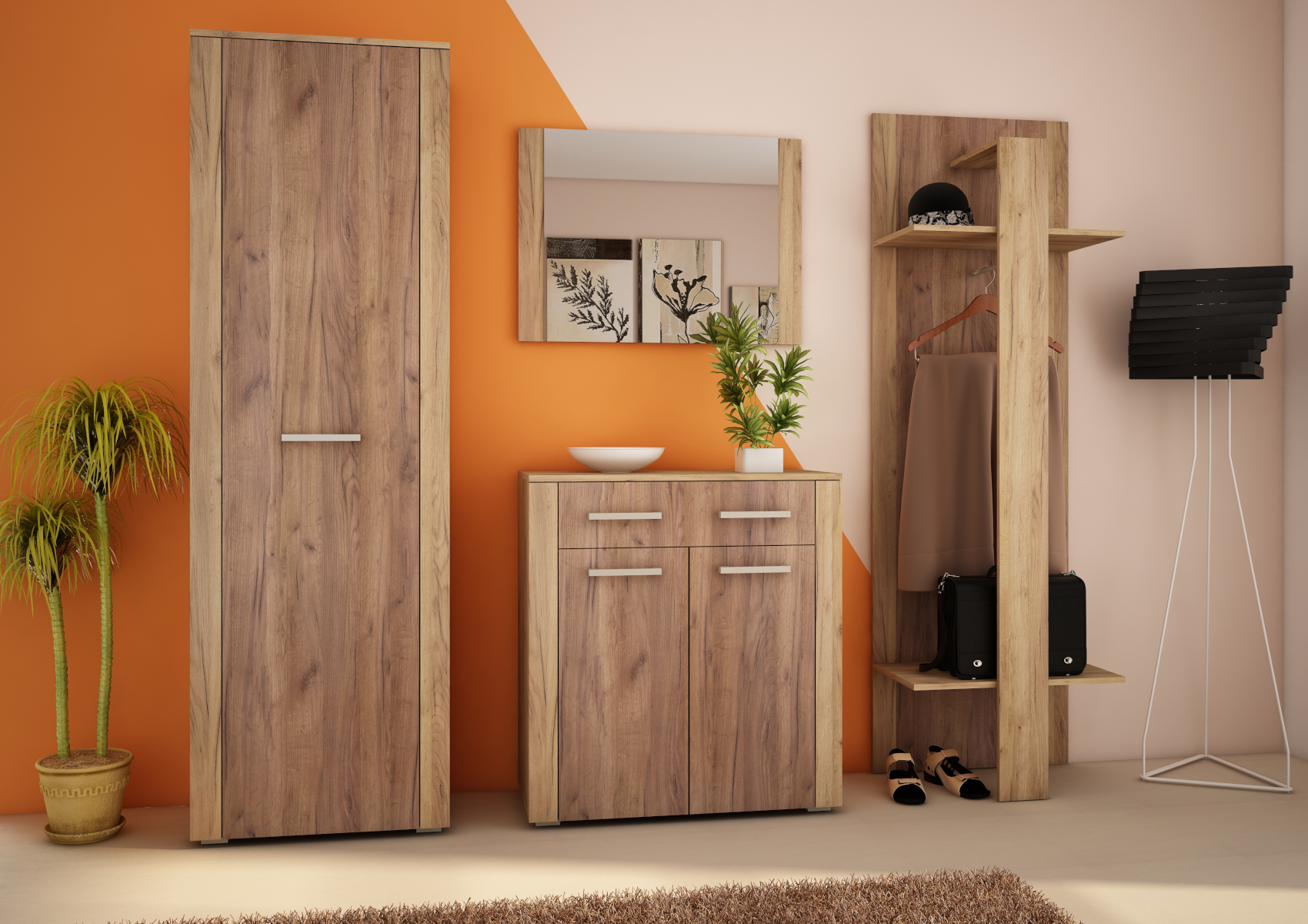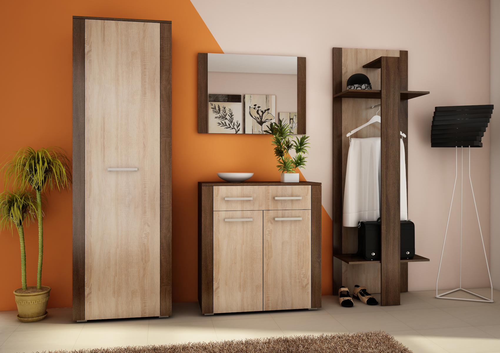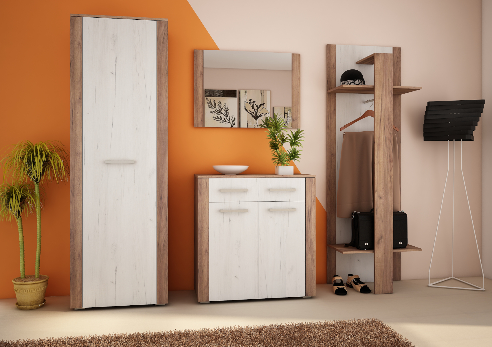 Tato sestava se skládá z komody, skříně a zajímavě řešeného věšáku.