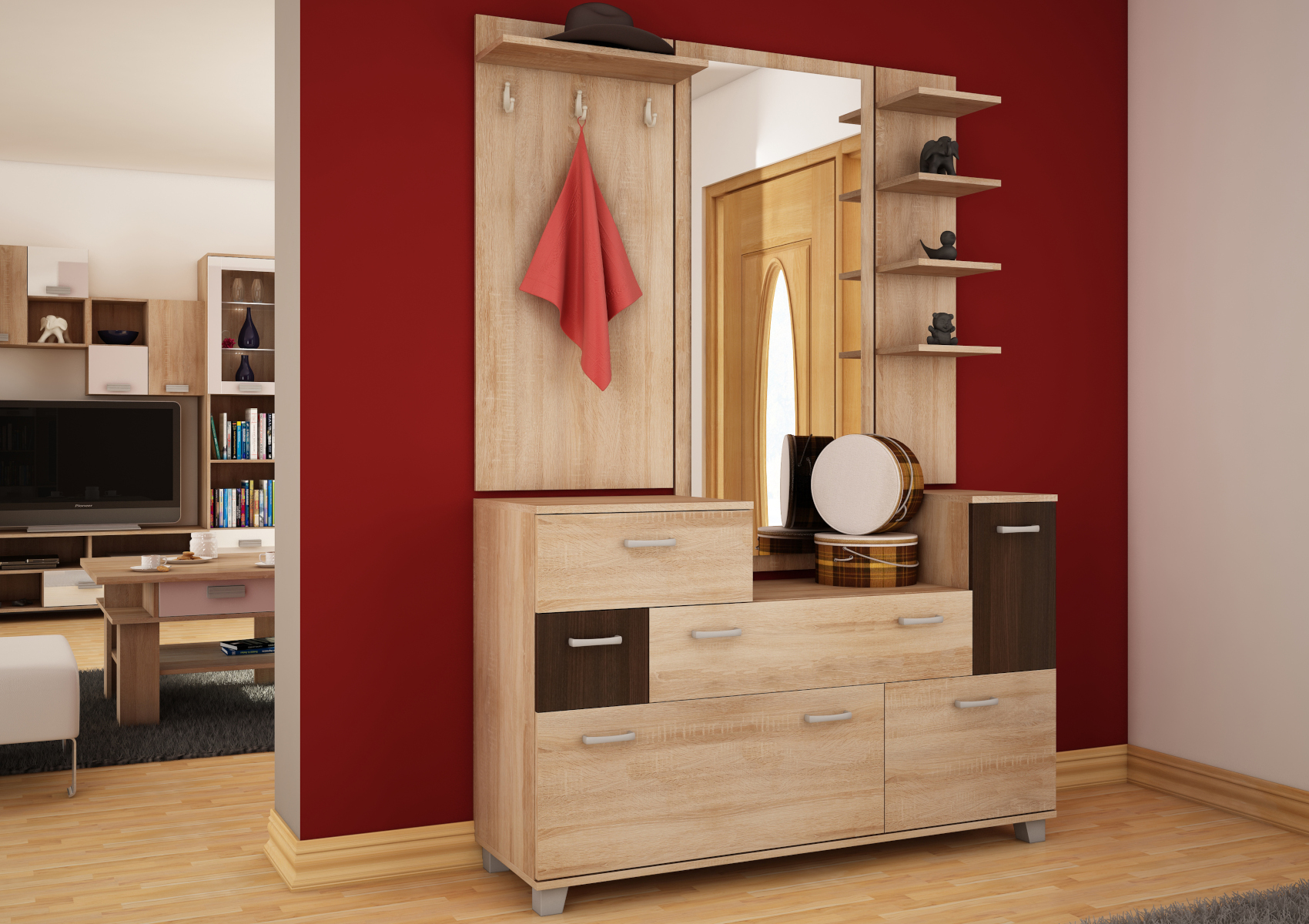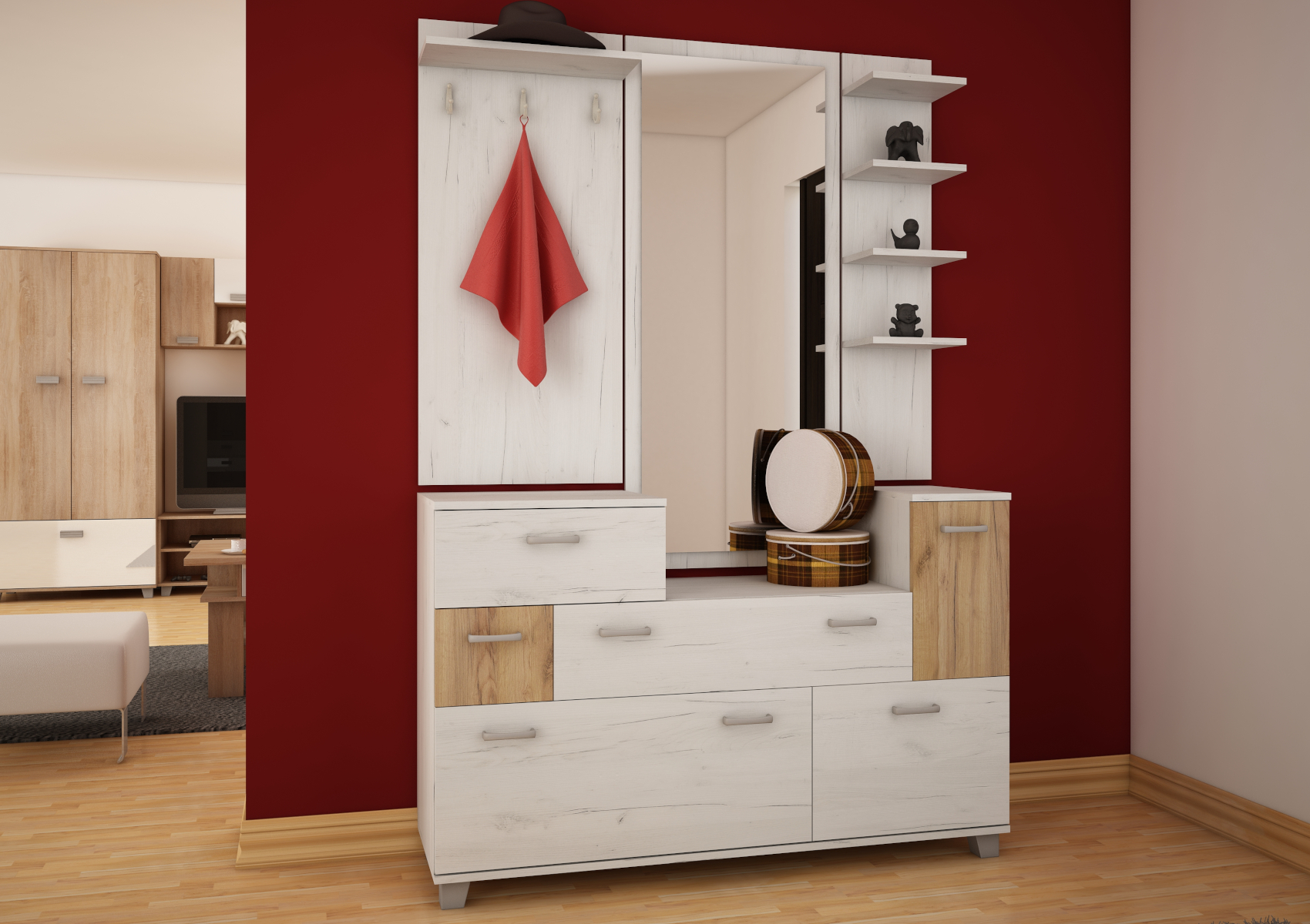 Prostorná předsíňová stěna Grand, je oblíbená díky svému velkému úložnému prostoru v podobě zásuvek a poliček. Ve spodní části jsou výklopy na uložení obuvi. Předsíň Grand je vyrobena z 16mm lamina, na výběr z několika barevných variant.