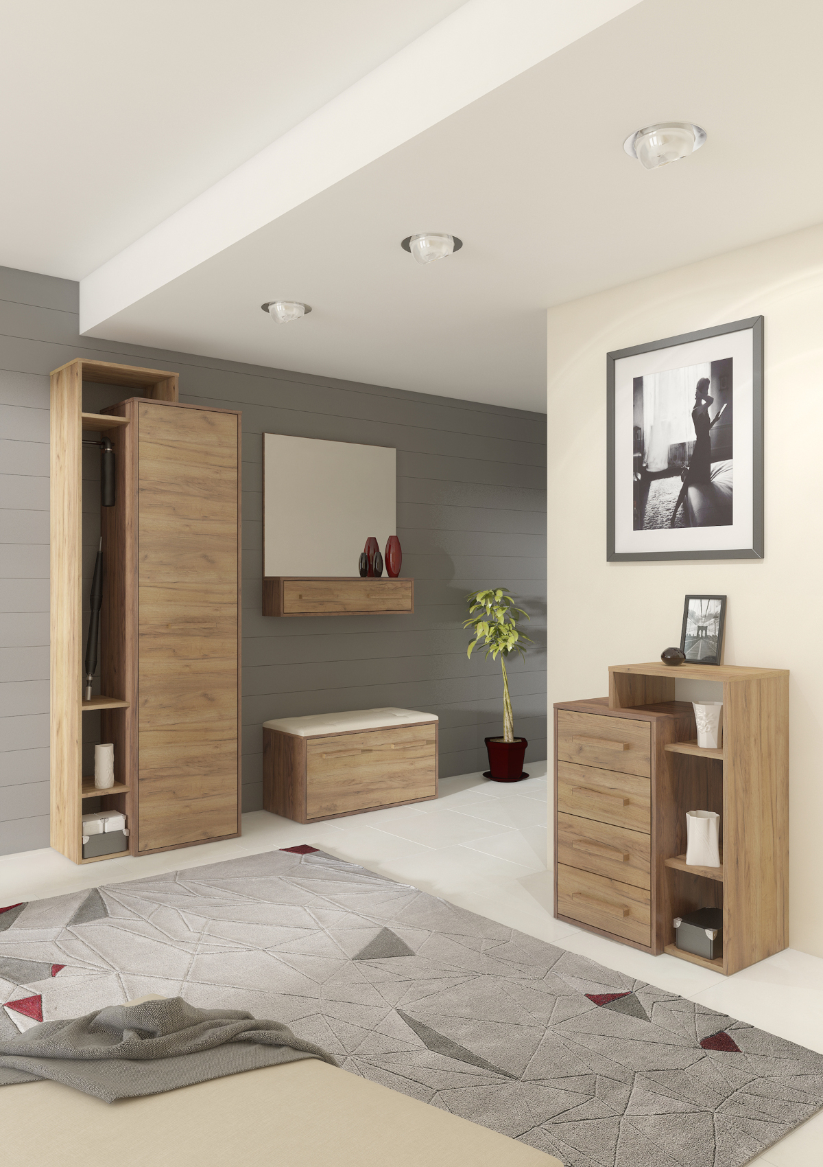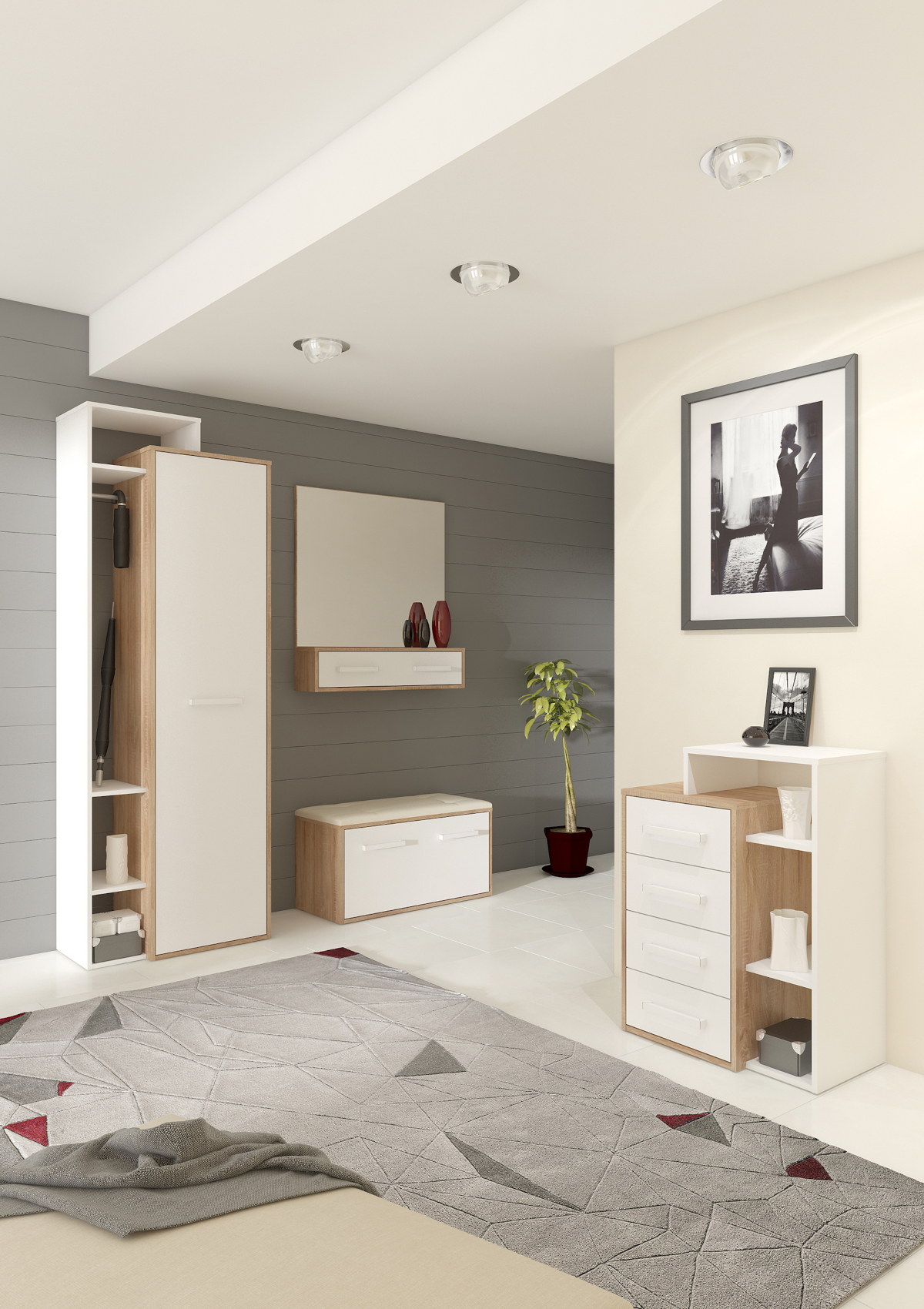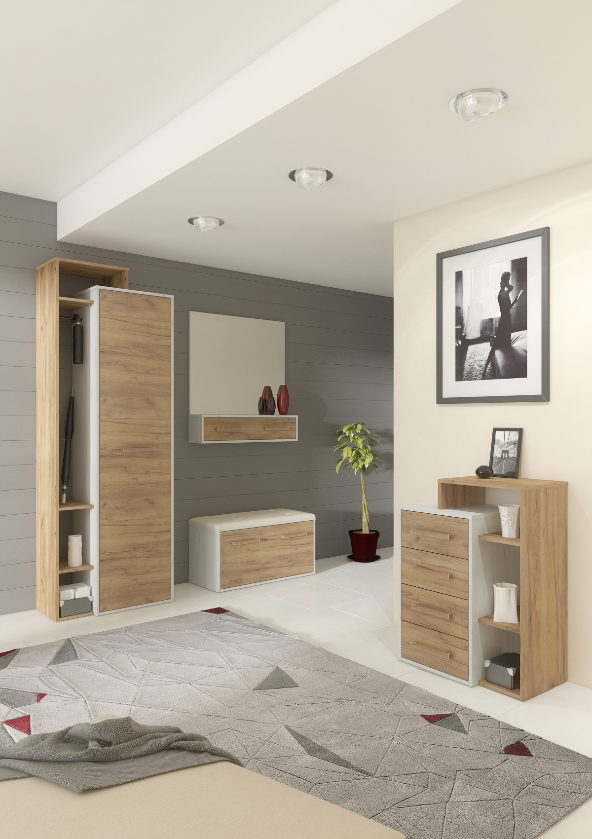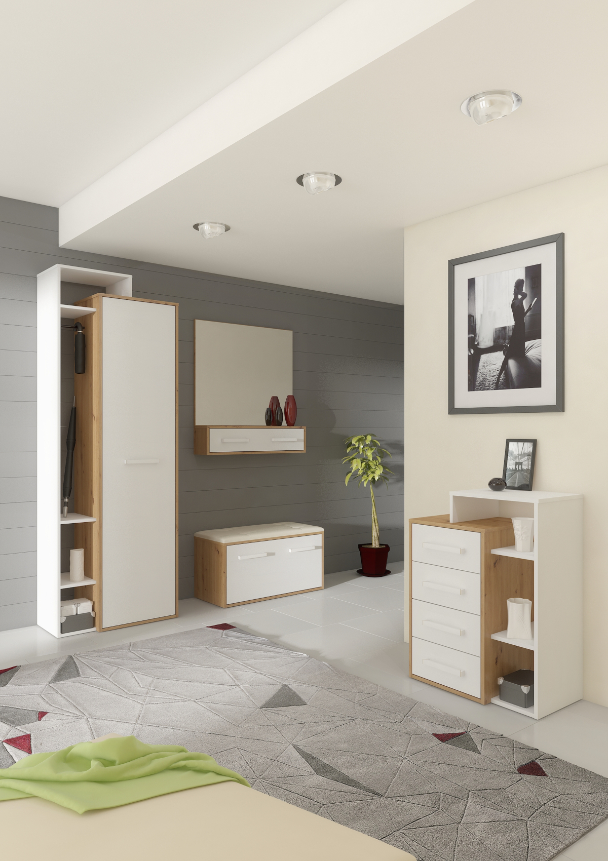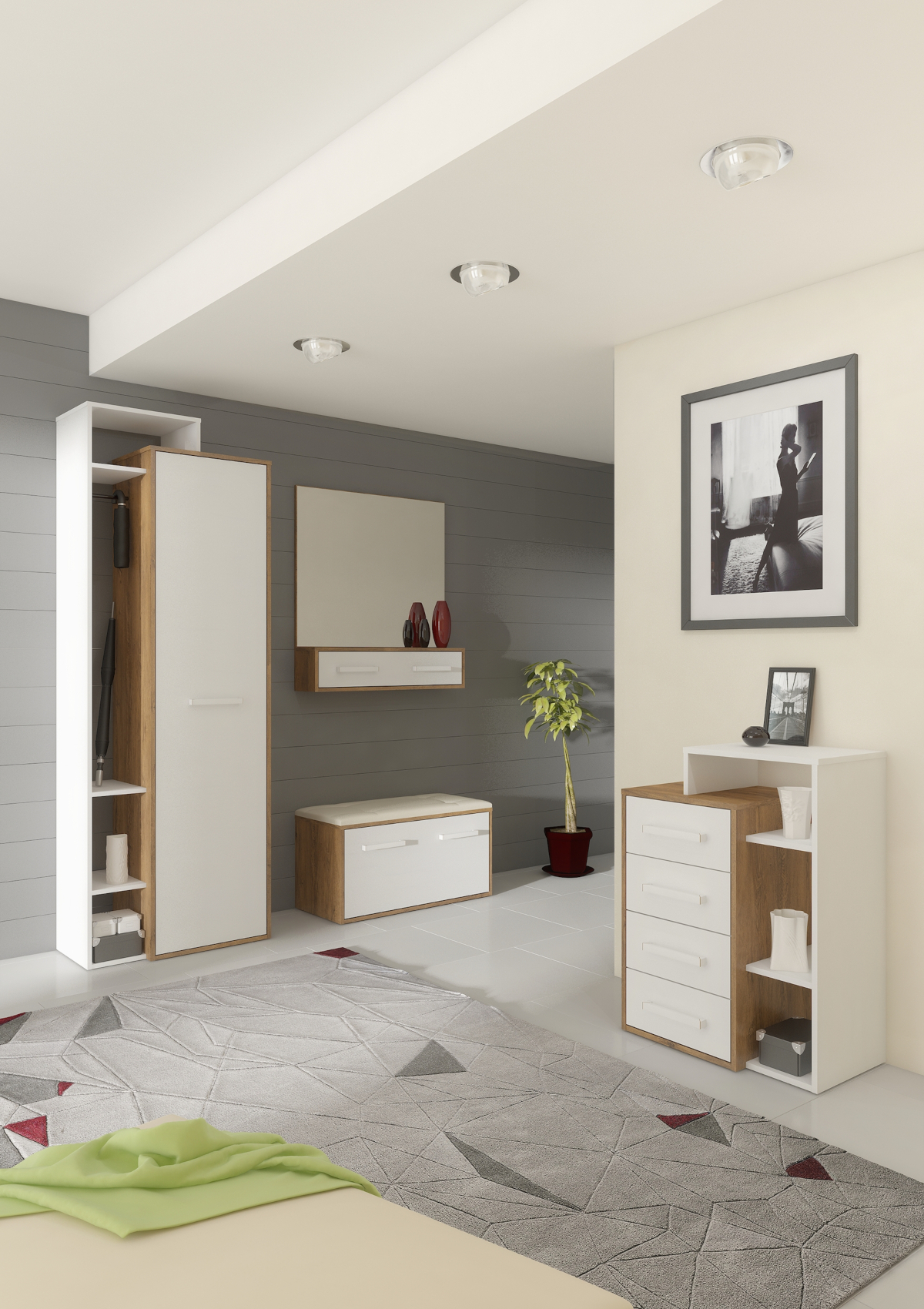 Předsíň Rio 12 nabízí - komoda P4S Rio 09, zrcadlo Rio 10, skříň L1D Rio 21 a botník Rio 25.