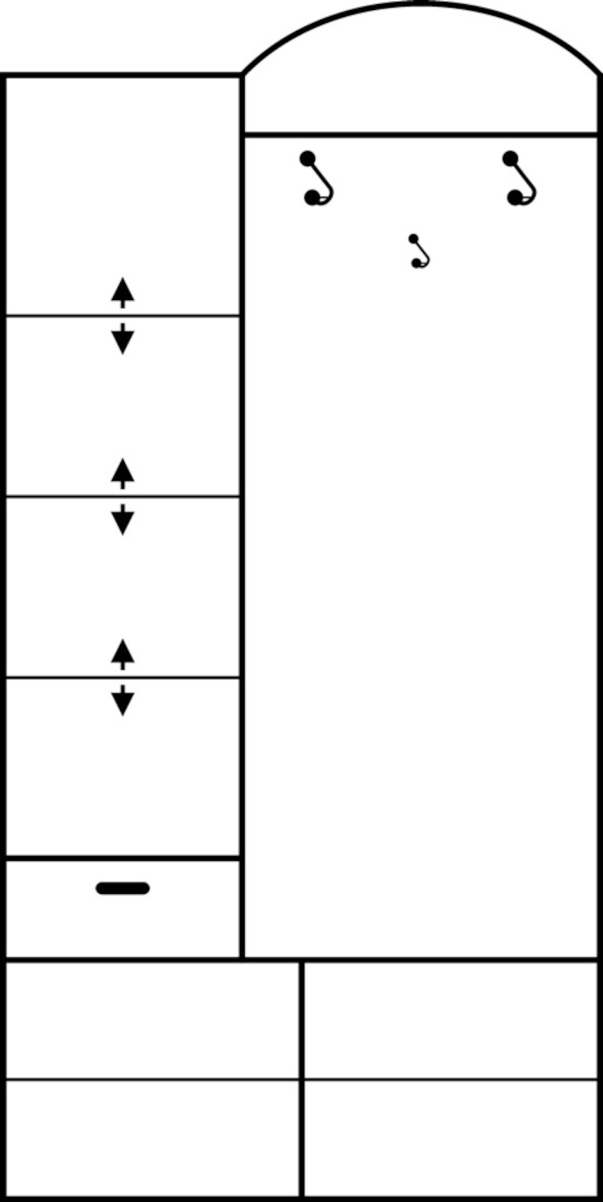 Předsíňová stěna Prince 2 se zrcadlem má nadčasový design a praktický úložný prostor. Najde uplatnění především v prostorově menších interiérech. Má výškově nastavitelné police. Předsíňová skříň je vyrobena z 16 mm lamina, na výběr z několika barevných variant. Vnitřní vybavení předsíňové sestavy viz. obrázek.