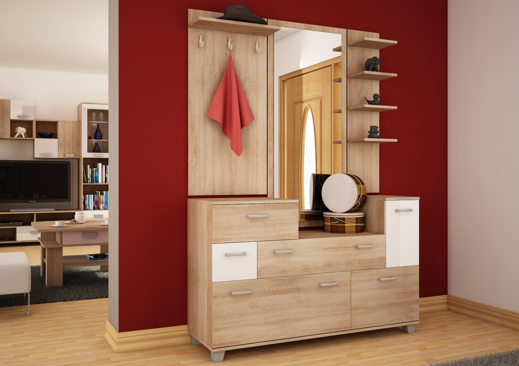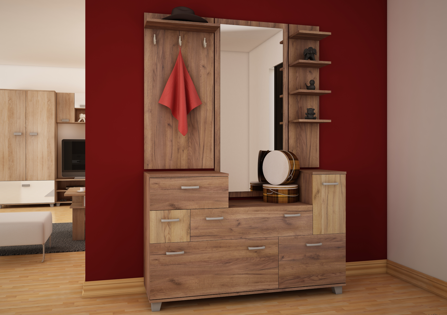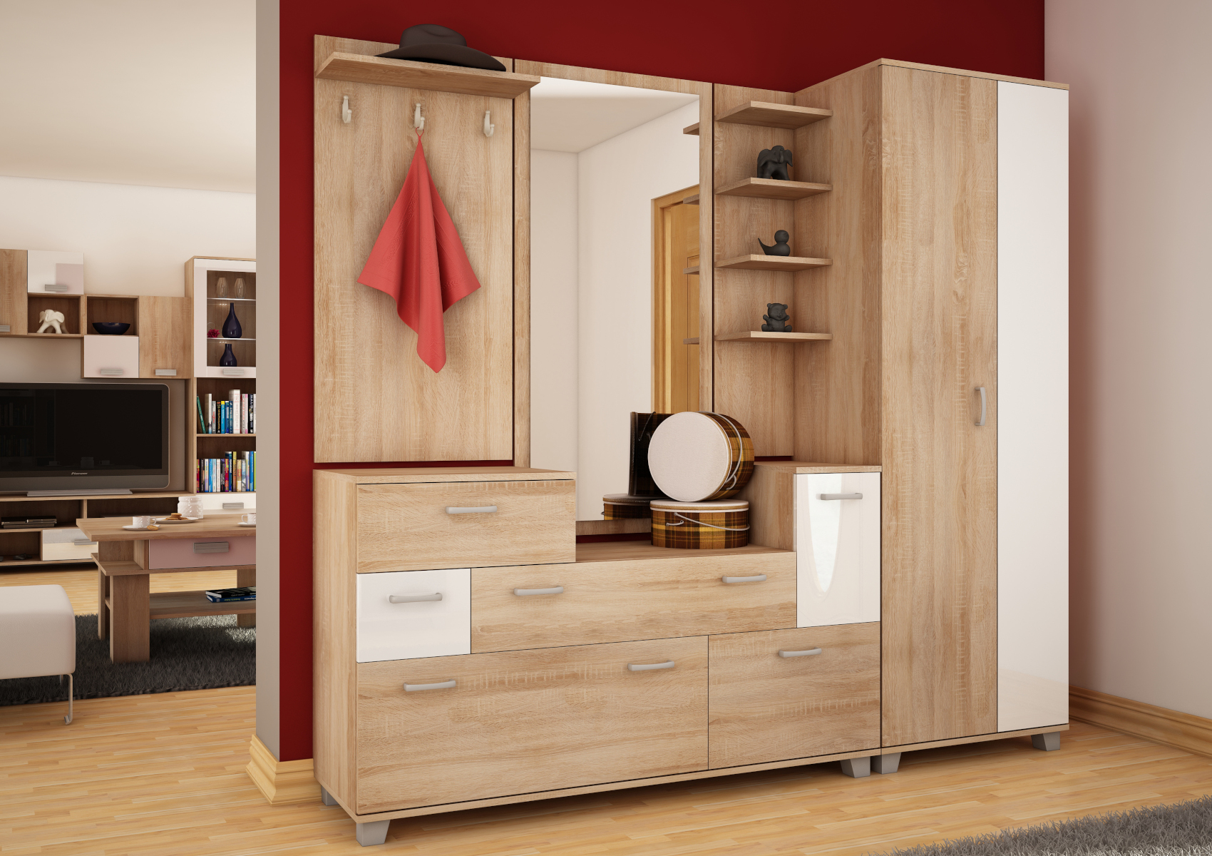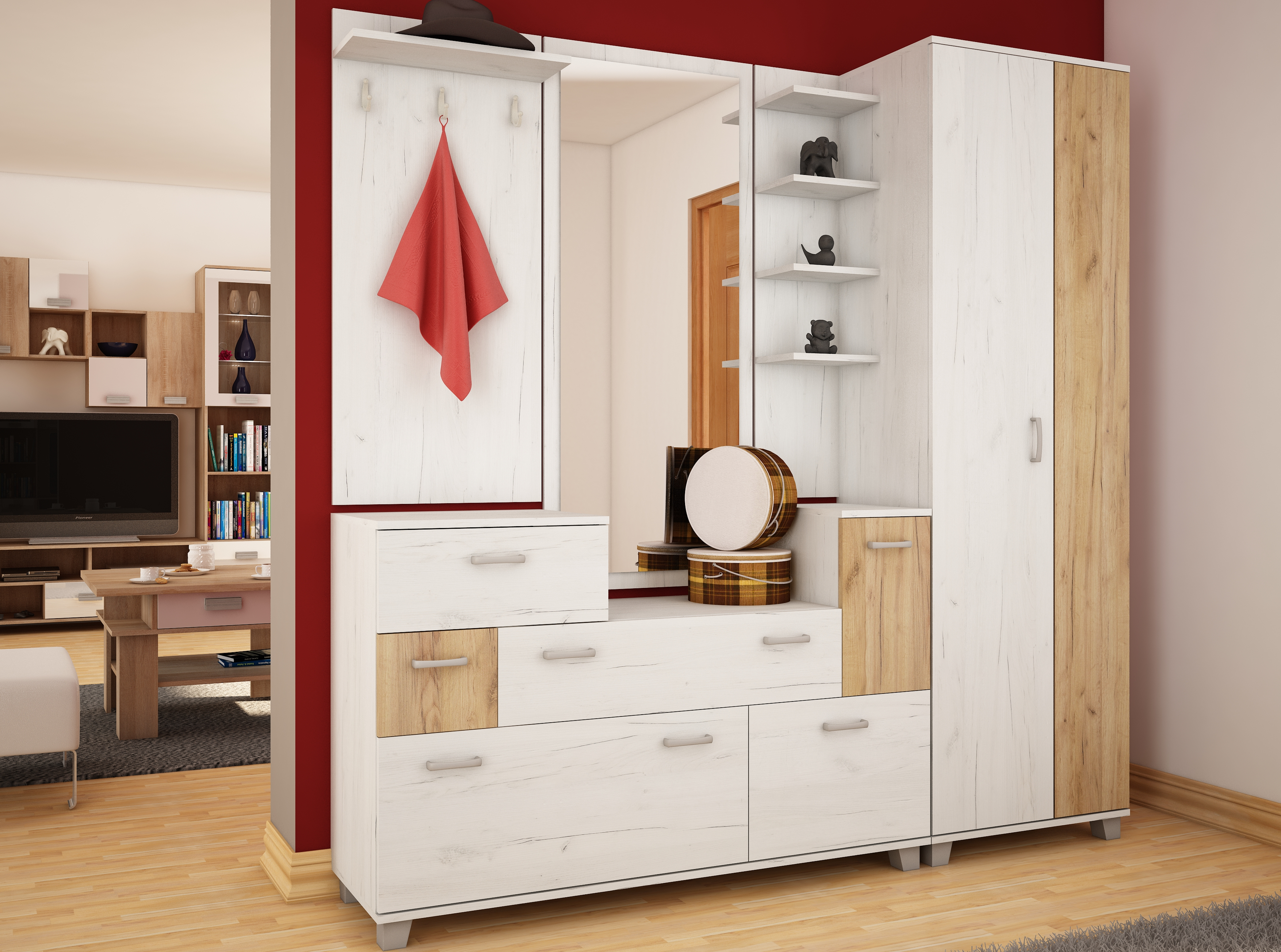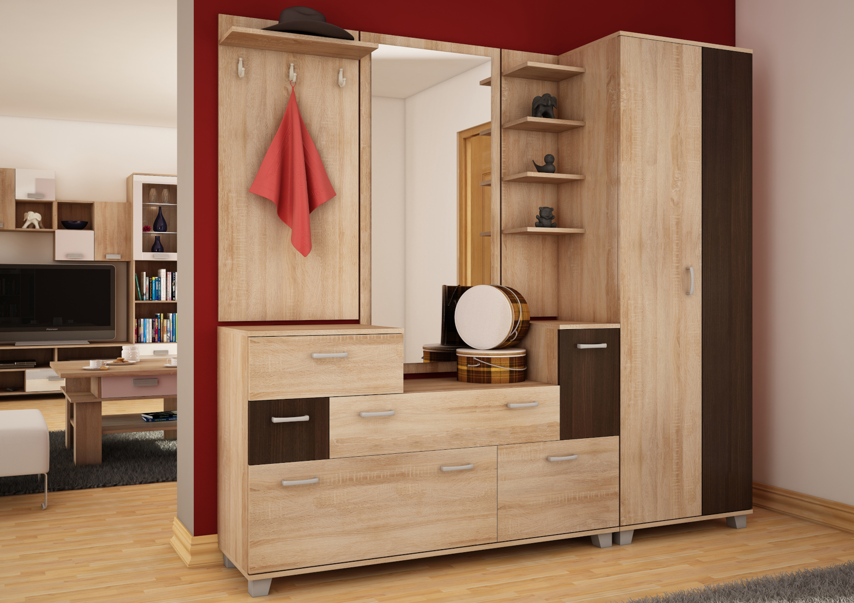 Prostorná skříň Grand, je oblíbená díky svému velkému úložnému prostoru. Vnitřní vybavení tvoří police a šatní tyč. Předsíňová skříň Grand je vyrobena z 16mm lamina, na výběr z několika barevných variant.