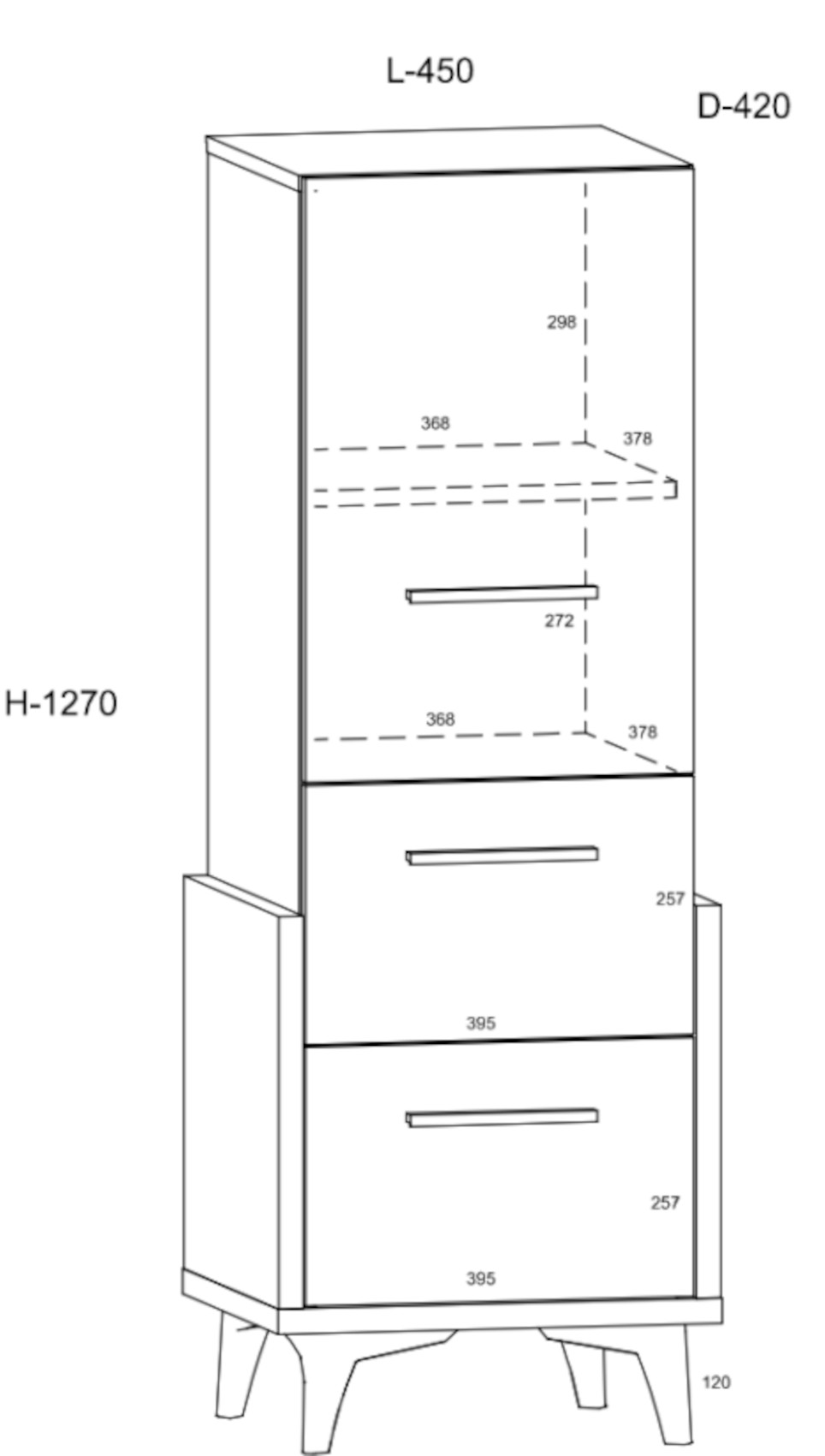 Součástí skříňky jsou 1 dvířka, za kterými je vložena 1 lakovaná police. Ve spodní části jsou 2 zásuvky na kovových pojezdech.