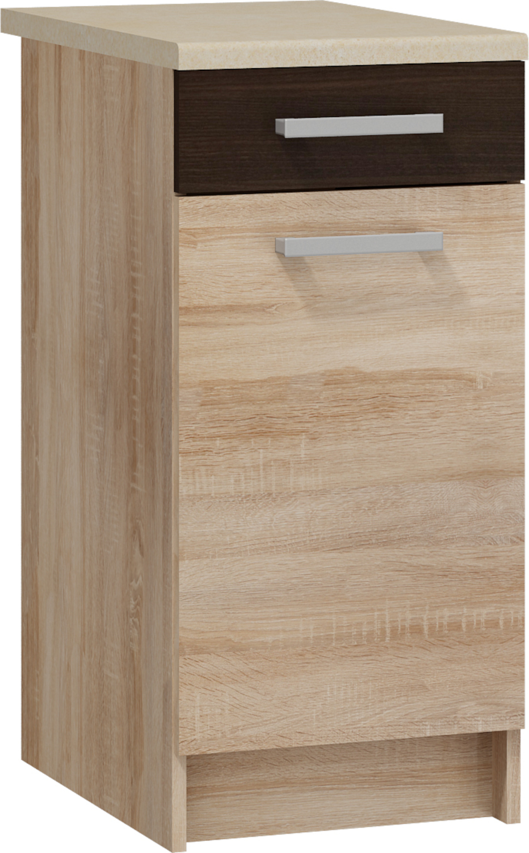 Spodní skříňka S-40 vyrobena z LTD 16 mm, skříňka má jedny otevírací dvířka, které lze libovolně namontovat na pravou nebo levou stranu a jednu praktickou zásuvku. Výběr z několika barevných variant (korpus / přední plocha / pásek). Dodáváno v demontu.
