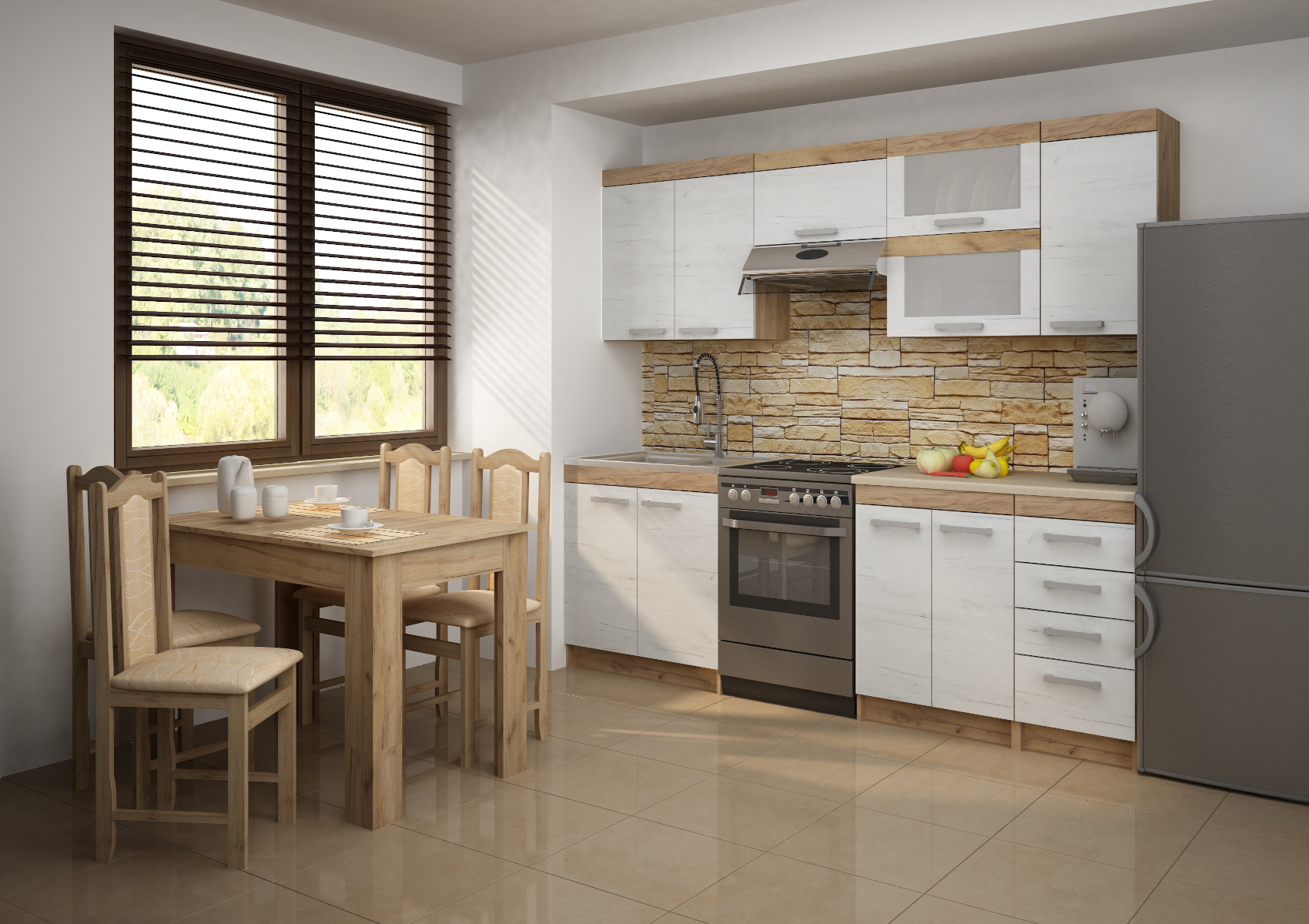 V ceně není zahrnuta pracovní deska. Cena pracovní desky za 1bm je 1392,- Kč. V případě požadavku rozměrů na míru pracovní desky je nutná samostatná kalkulace. Uveďte rozměr v poznámce do objednávky, cena Vám bude potvrzena.