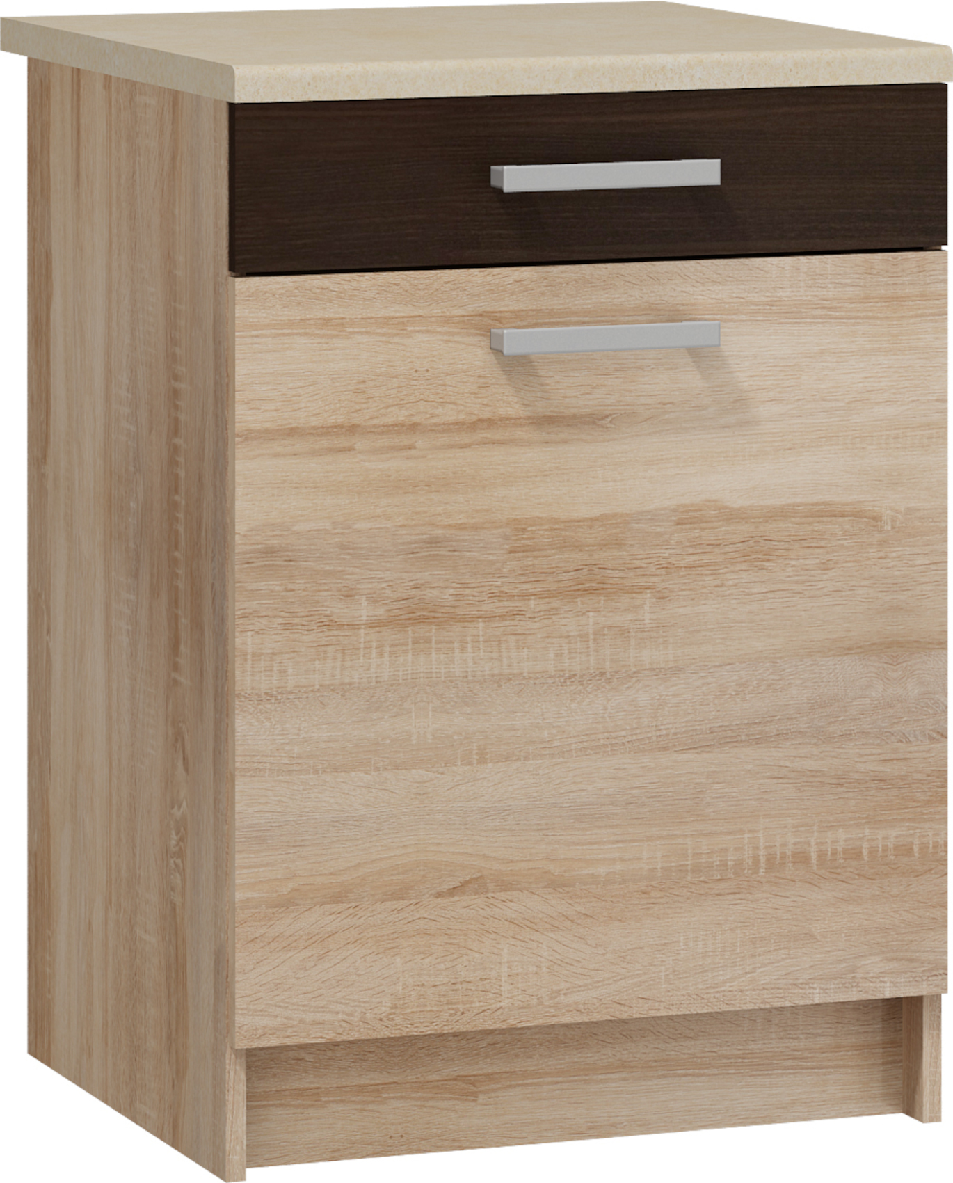 Spodní skříňka S-60 vyrobena z LTD 16 mm, skříňka má uvnitř jednu polici a jednu praktickou zásuvku. Dvířka lze libovolně namontovat na pravou nebo levou stranu. Výběr z několika barevných variant (korpus / přední plocha / pásek). Dodáváno v demontu.