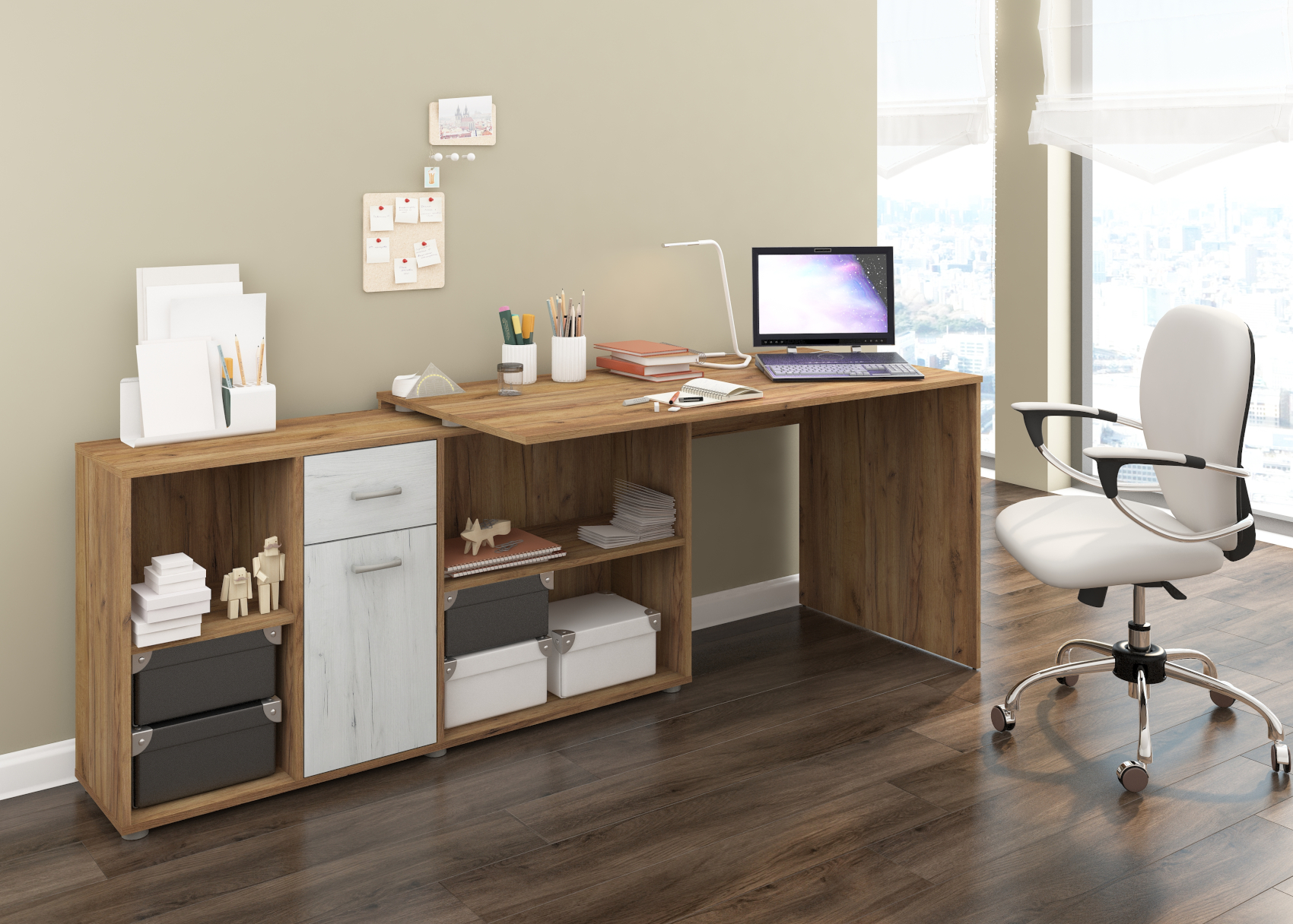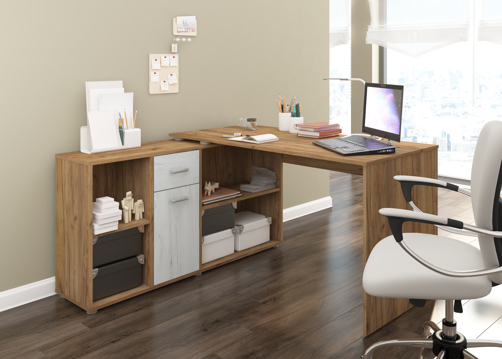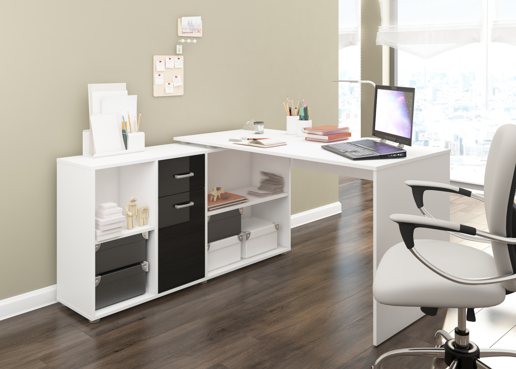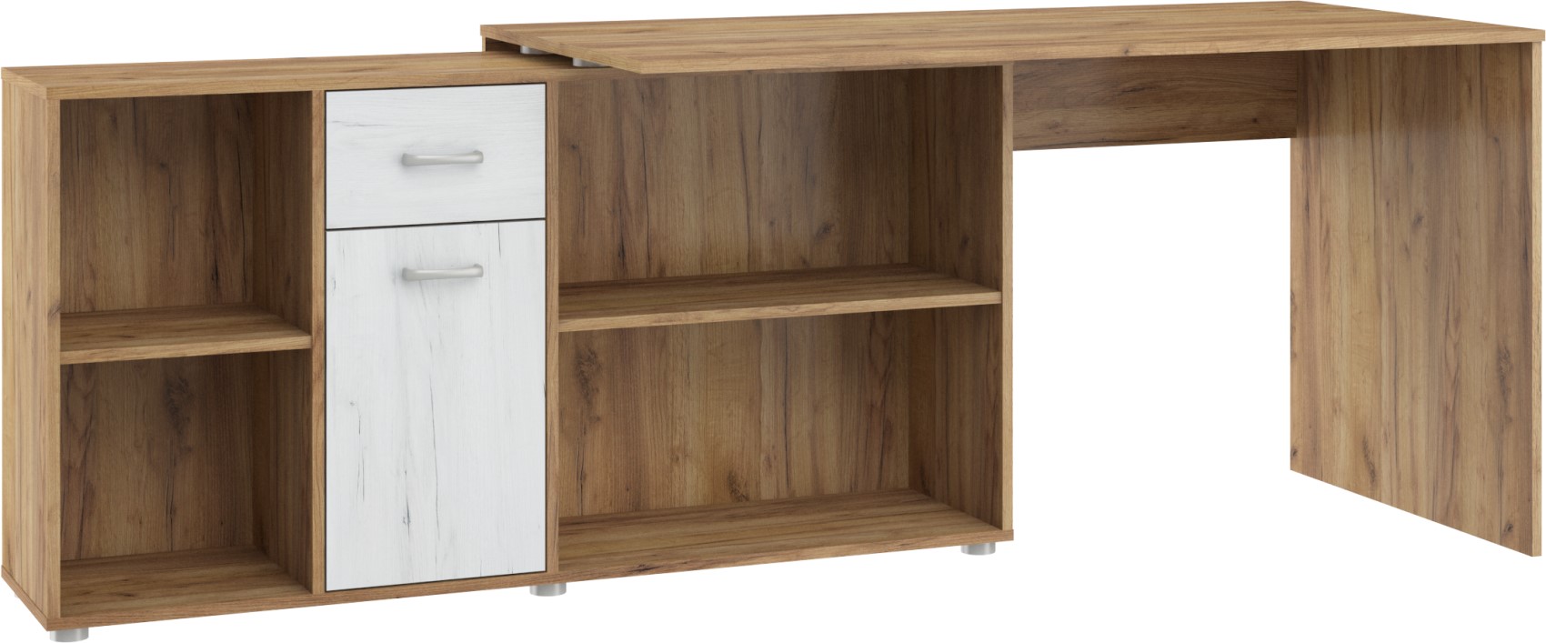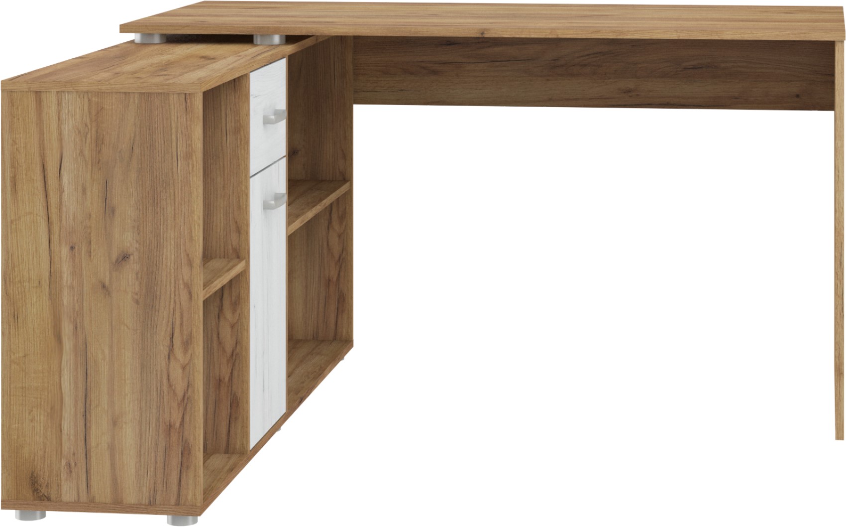 Psací stůl Beat L se skvěle hodí do moderně zařízených pracoven. Díky lamino materiálu, které je velice kvalitní, máte jistotu dlouhé životnosti a vysoké odolnosti. Stůl je velice praktický z hlediska dvou způsobů uspořádání a to tak, že si můžete stůl umístit podélně a vytvořit si tak velkou pracovní plochu a nebo můžete stůl umístit rohově a vznikne vám tak útulný pracovní prostor.Stůl si můžete vybrat z několika barevných variant. Psací stůl Beat L je orientován na levou stranu.