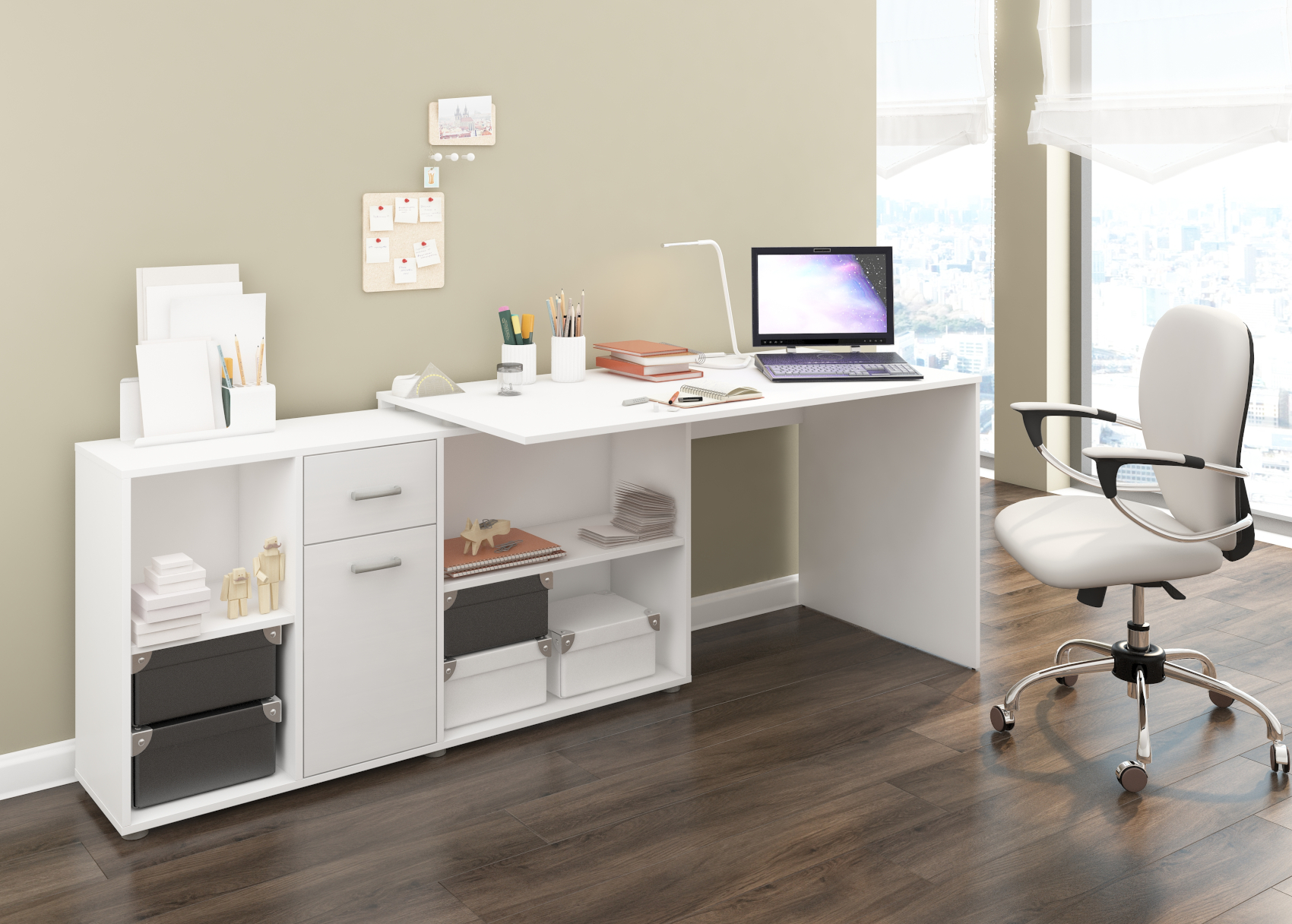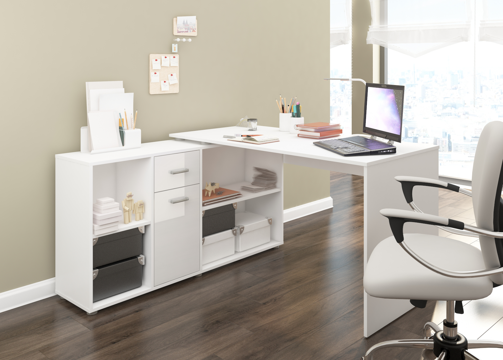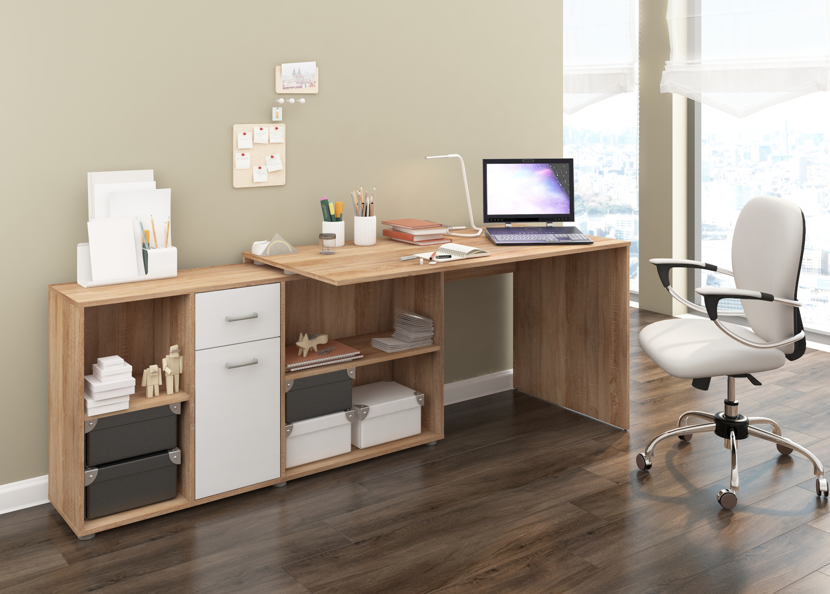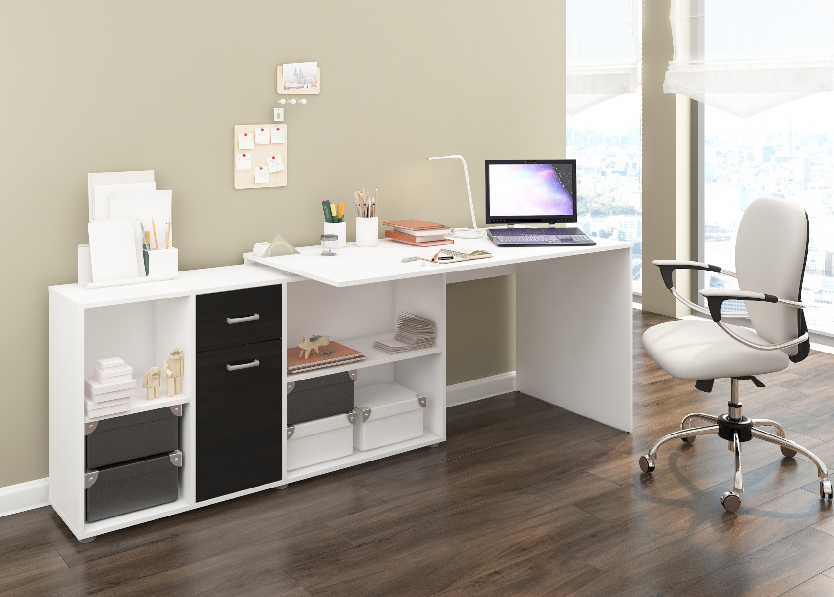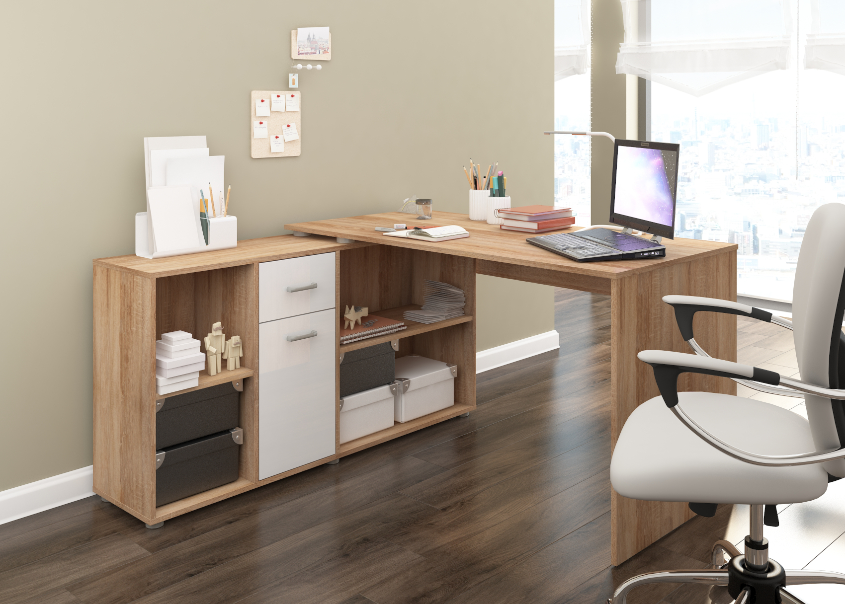 Psací stůl Beat L se skvěle hodí do moderně zařízených pracoven. Díky lamino materiálu, které je velice kvalitní, máte jistotu dlouhé životnosti a vysoké odolnosti. Stůl je velice praktický z hlediska dvou způsobů uspořádání a to tak, že si můžete stůl umístit podélně a vytvořit si tak velkou pracovní plochu a nebo můžete stůl umístit rohově a vznikne vám tak útulný pracovní prostor.Stůl si můžete vybrat z několika barevných variant. Psací stůl Beat L je orientován na levou stranu.