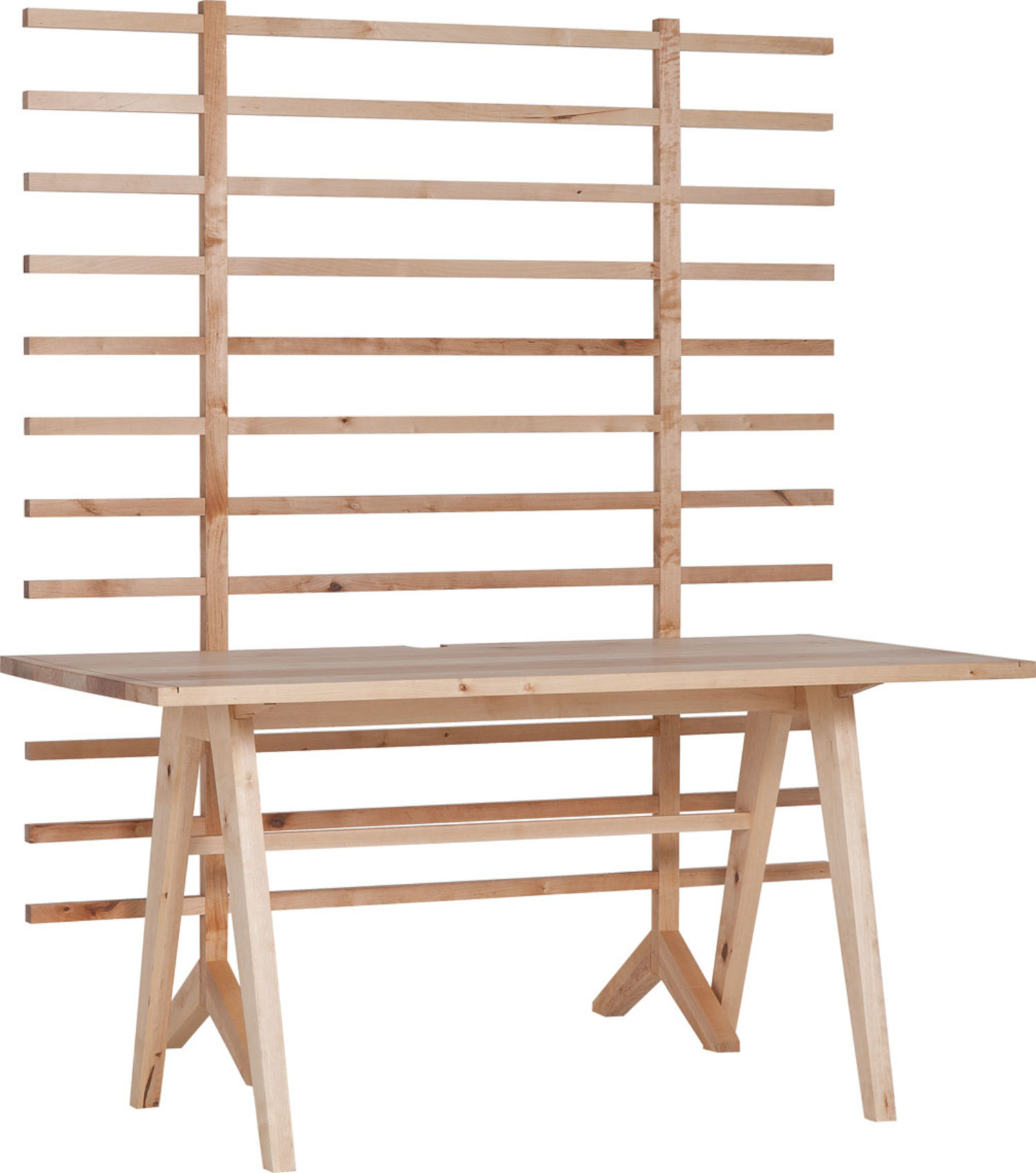 Ke stolu jsou přimontována obrazovka z dřevěných lišt, na které můžete zavěsit jakékoliv závěsné dekorace nebo kovové organizéry.