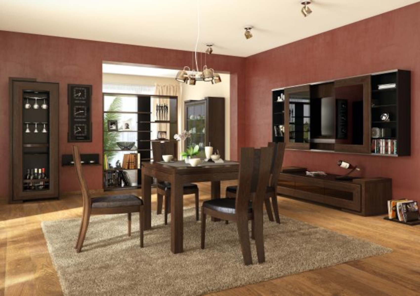 Jídelna je sestavena z komodit systémového nábytku Corino, ze kterých si můžete vybavit prostor dle vaší fantazie.