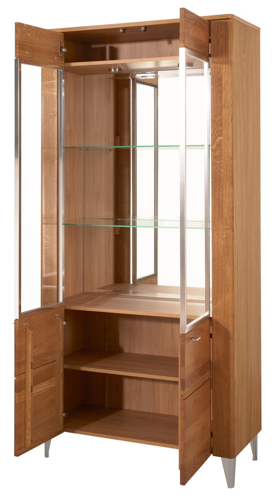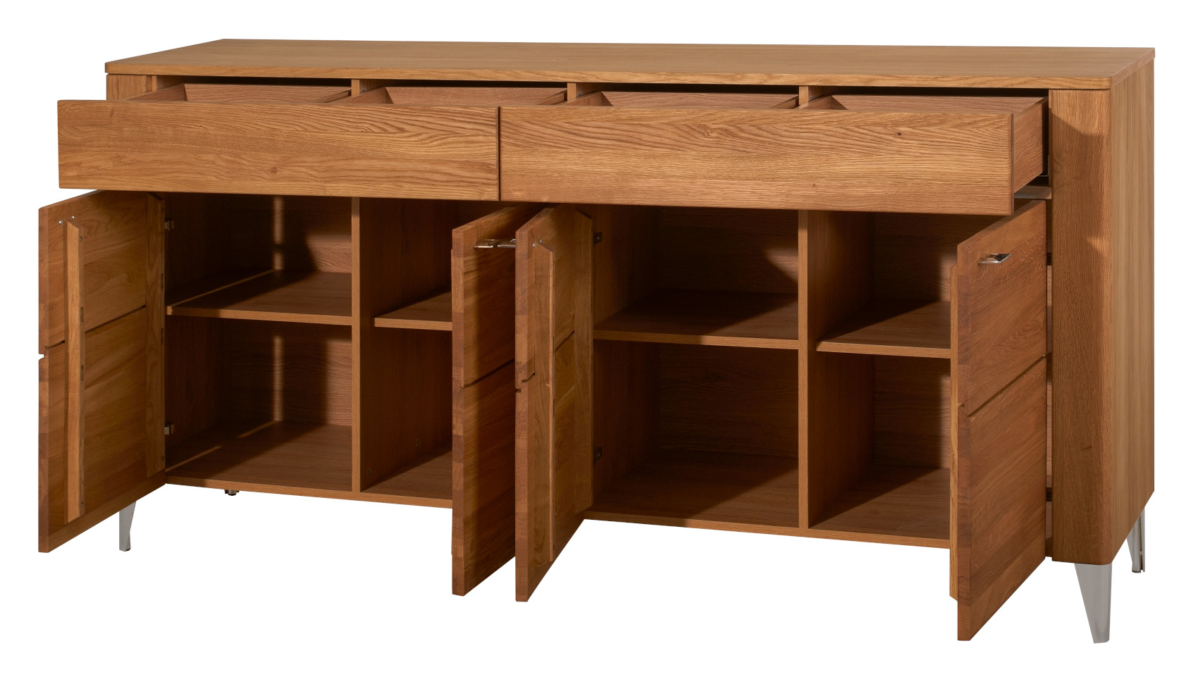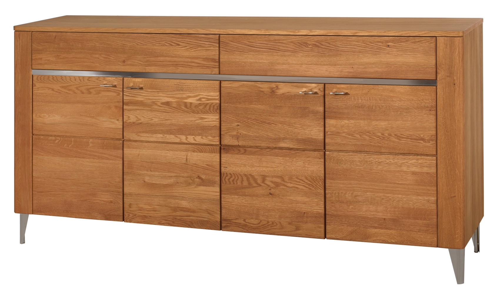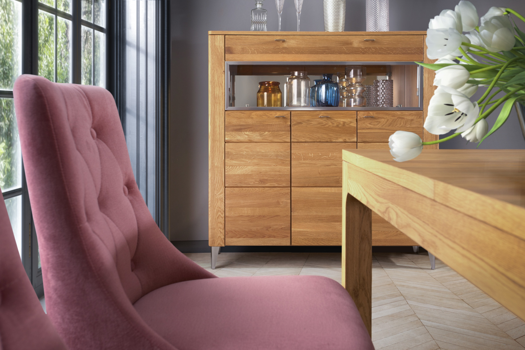 Jídelna Latina vás zaujme svým přírodním designem se strukturou dřevěných lét s chromovými detaily. Nábytek je vyroben z masivního dubového dřeva a přírodní dubové dýhy. Komody a vitríny stojí na chromových nožkách, které provzdušní celý váš interiér a úchyty jsou vyrobeny také z chromu.