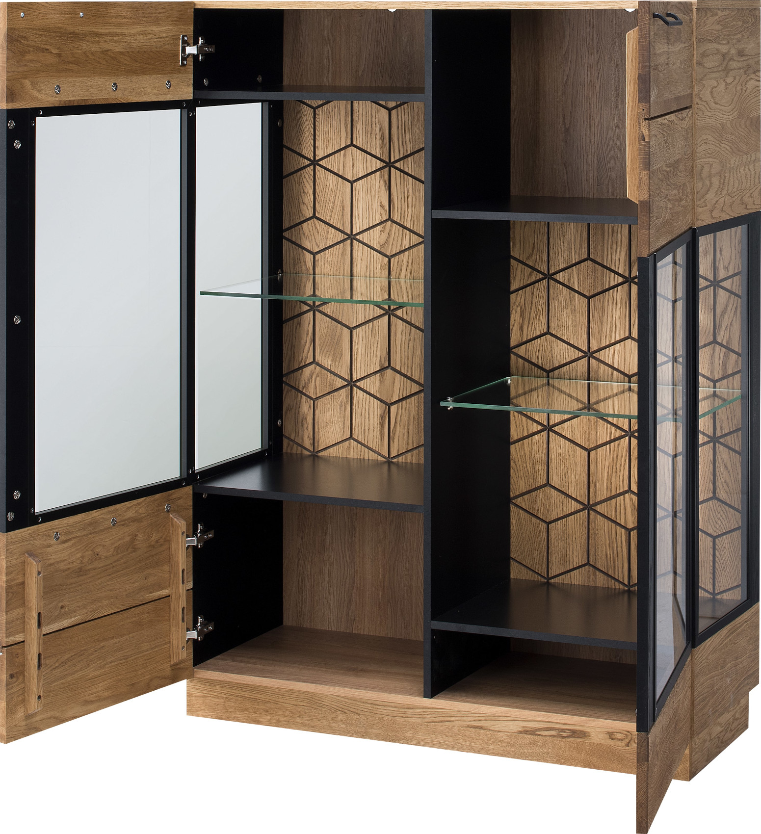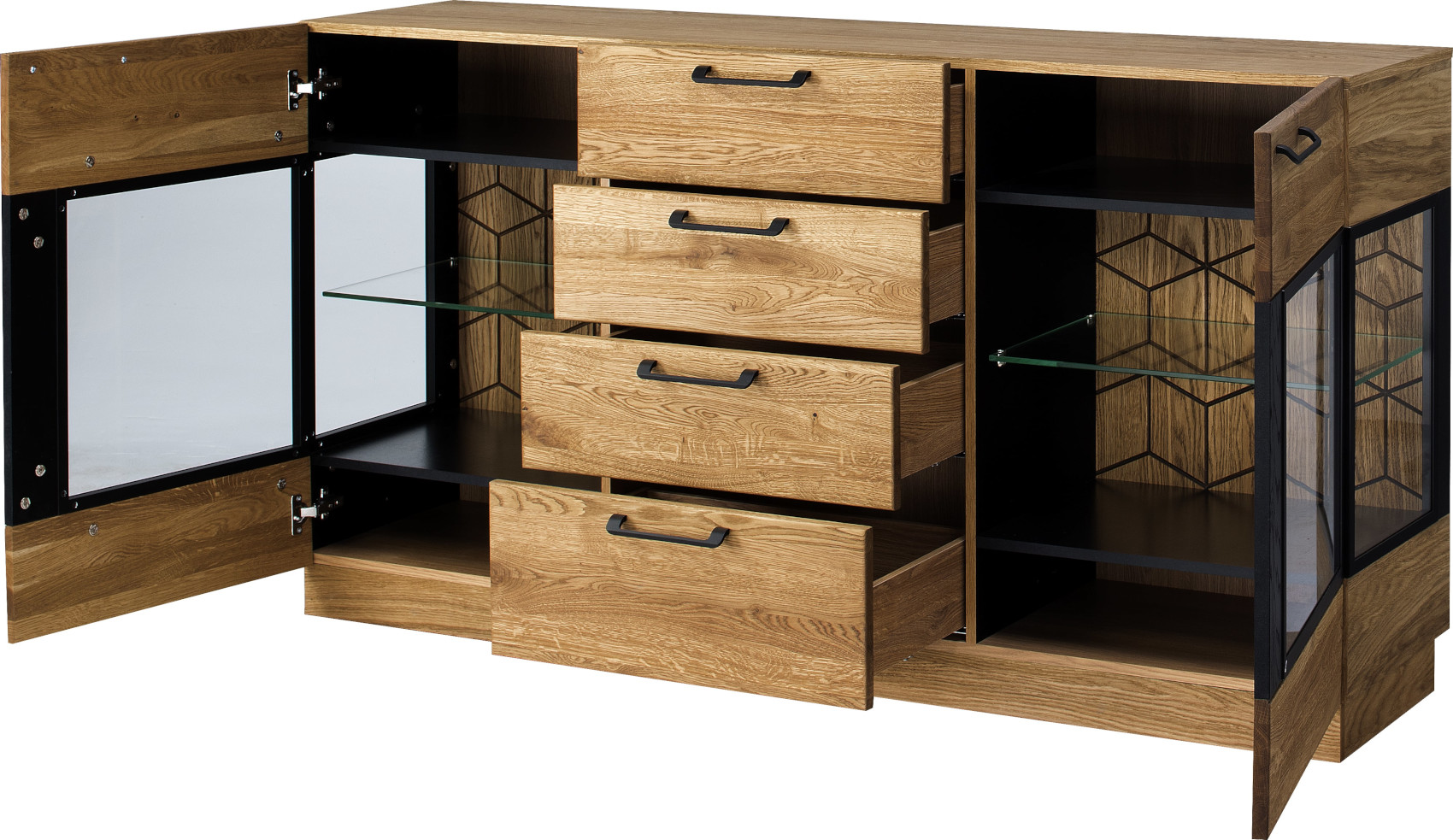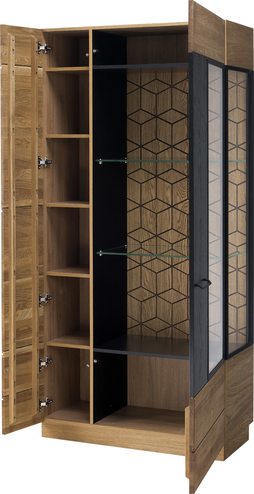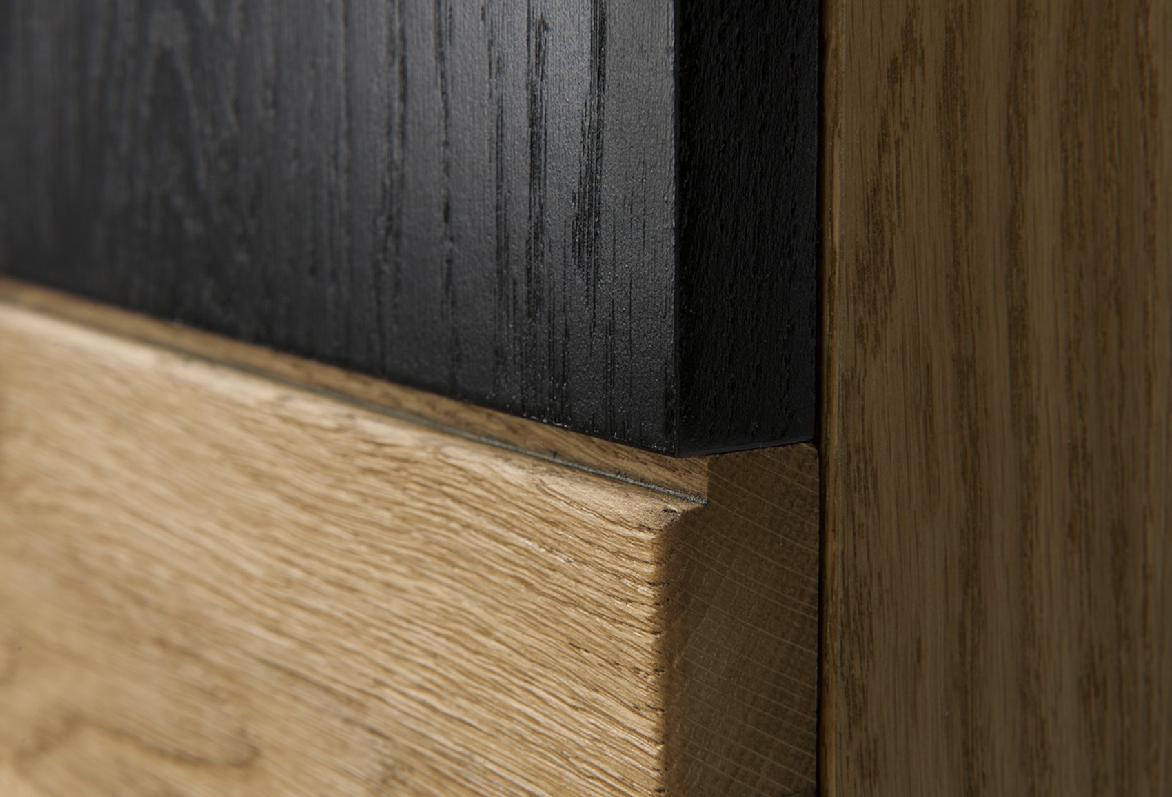Jídelna Mosaic vás zaujme svým luxusním designem se strukturou přírodního dřeva. Nábytek je vyroben z masivního dubového dřeva a přírodní dubové dýhy. Jedinečnými prvky jsou černé matné lakované detaily na dvířkách a zadních stěnách vitrín. Veškerá dvířka i zásuvky systému Mosaic mají černě matné úchyty.