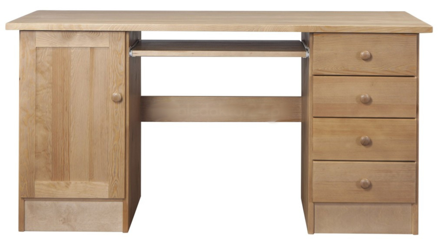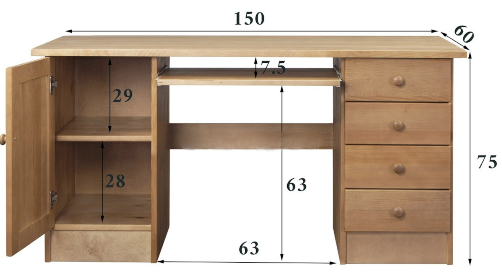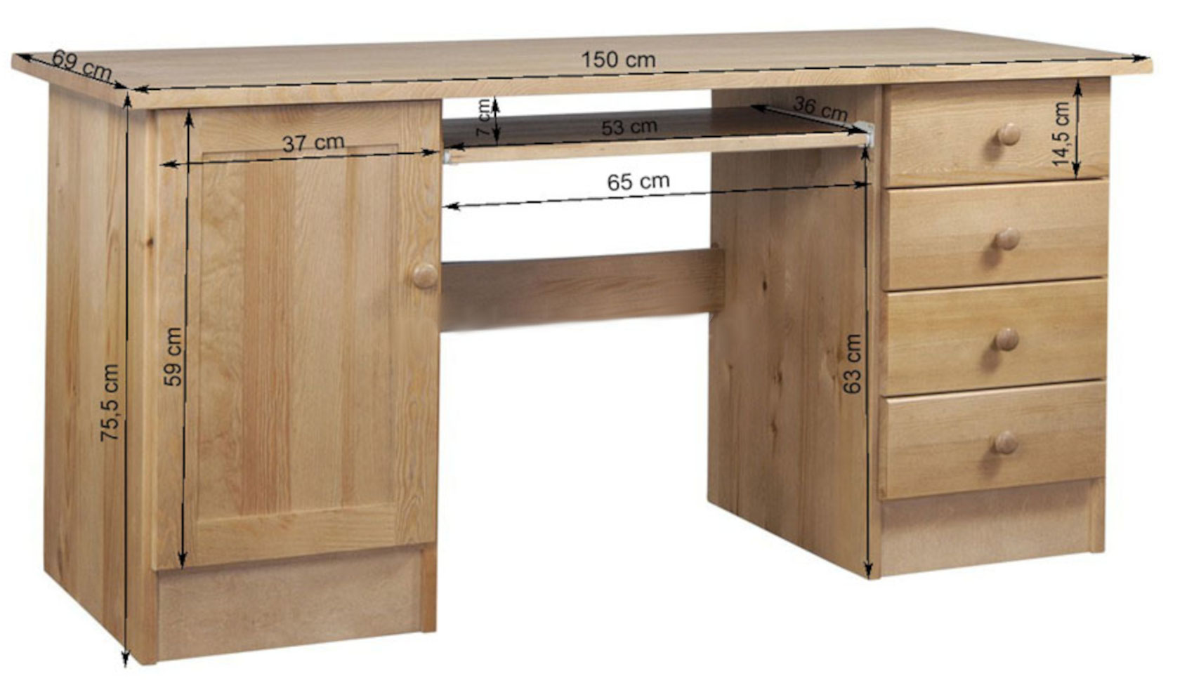 Psací stůl má na levé straně dvířka, za kterými je vložena police a na pravé straně jsou 4 zásuvky na kovových pojezdech. Pod horní deskoz je výsuvná police k uložení počítačové klávesnice nebo dokumentů.