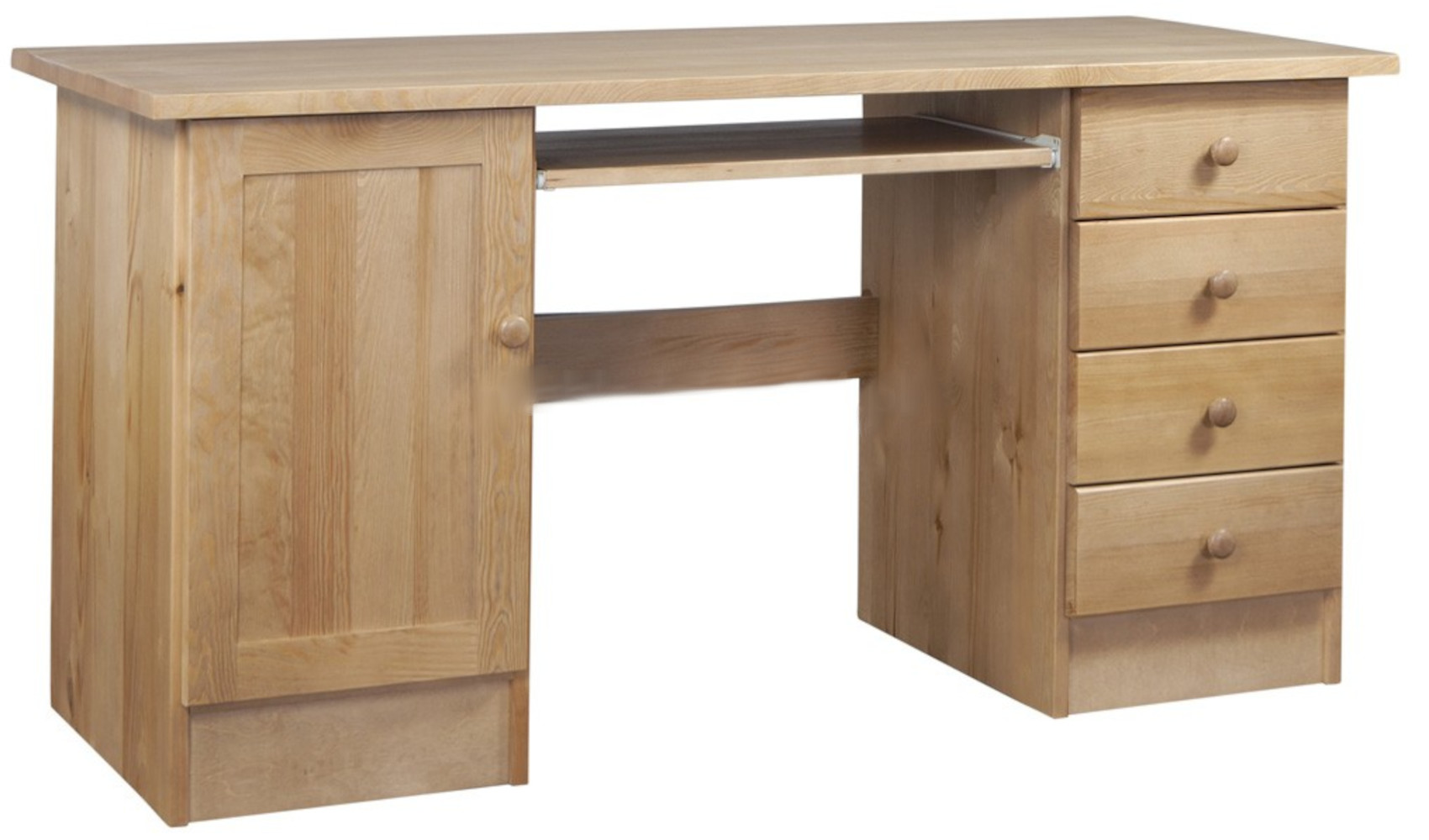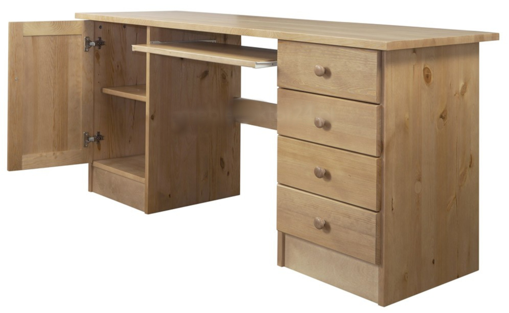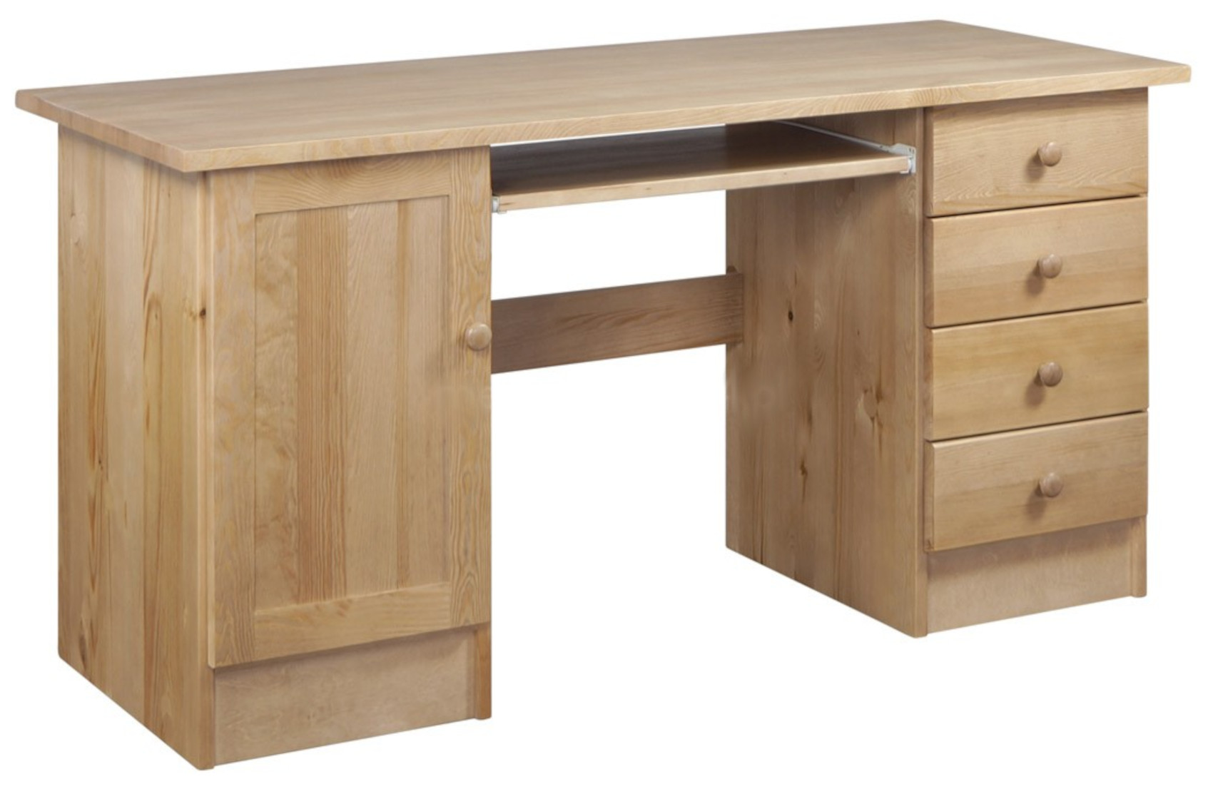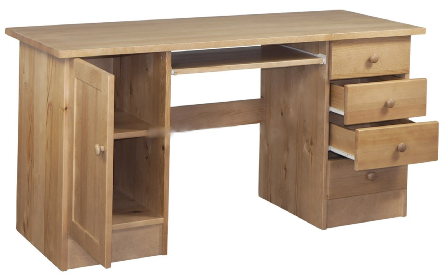 Psací stůl má na levé straně dvířka, za kterými je vložena police a na pravé straně jsou 4 zásuvky na kovových pojezdech. Pod horní deskoz je výsuvná police k uložení počítačové klávesnice nebo dokumentů.