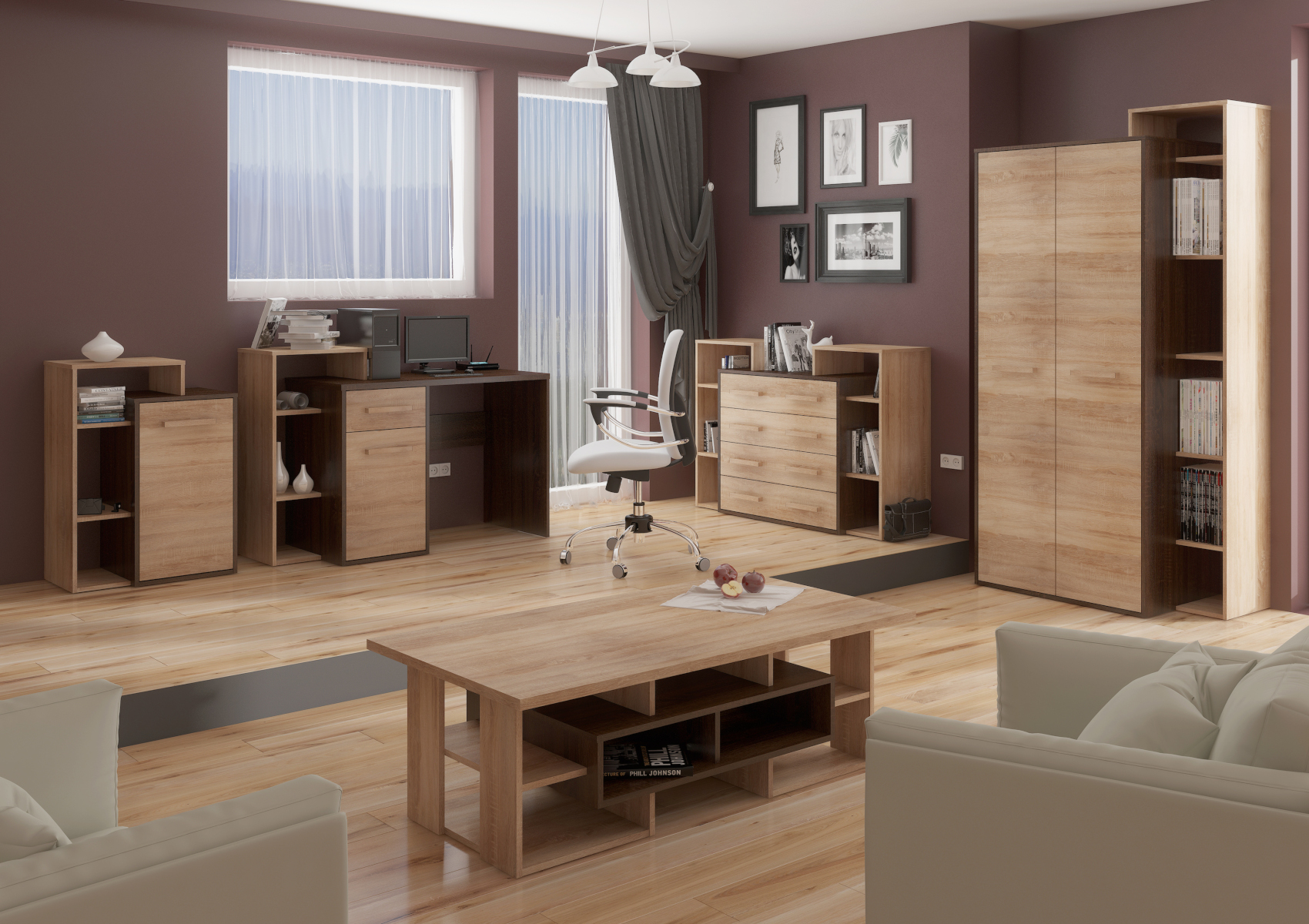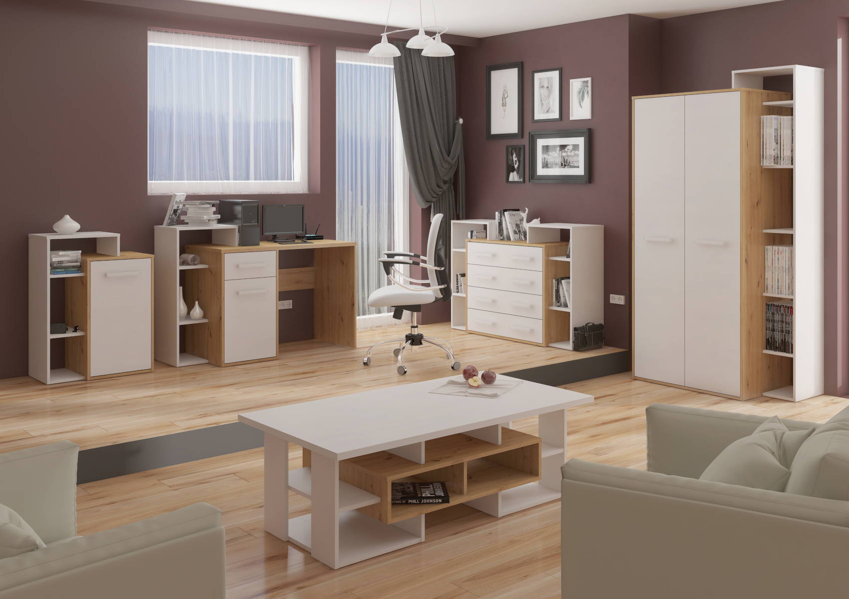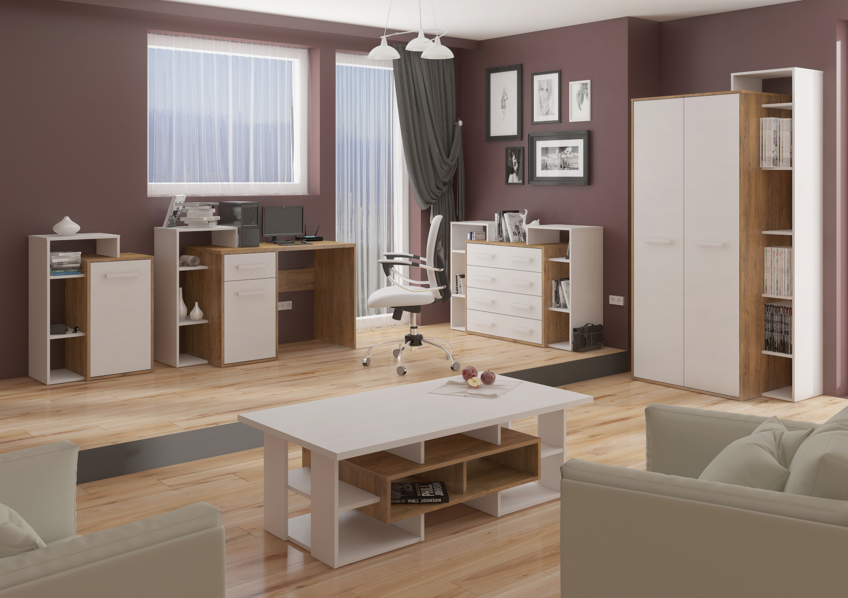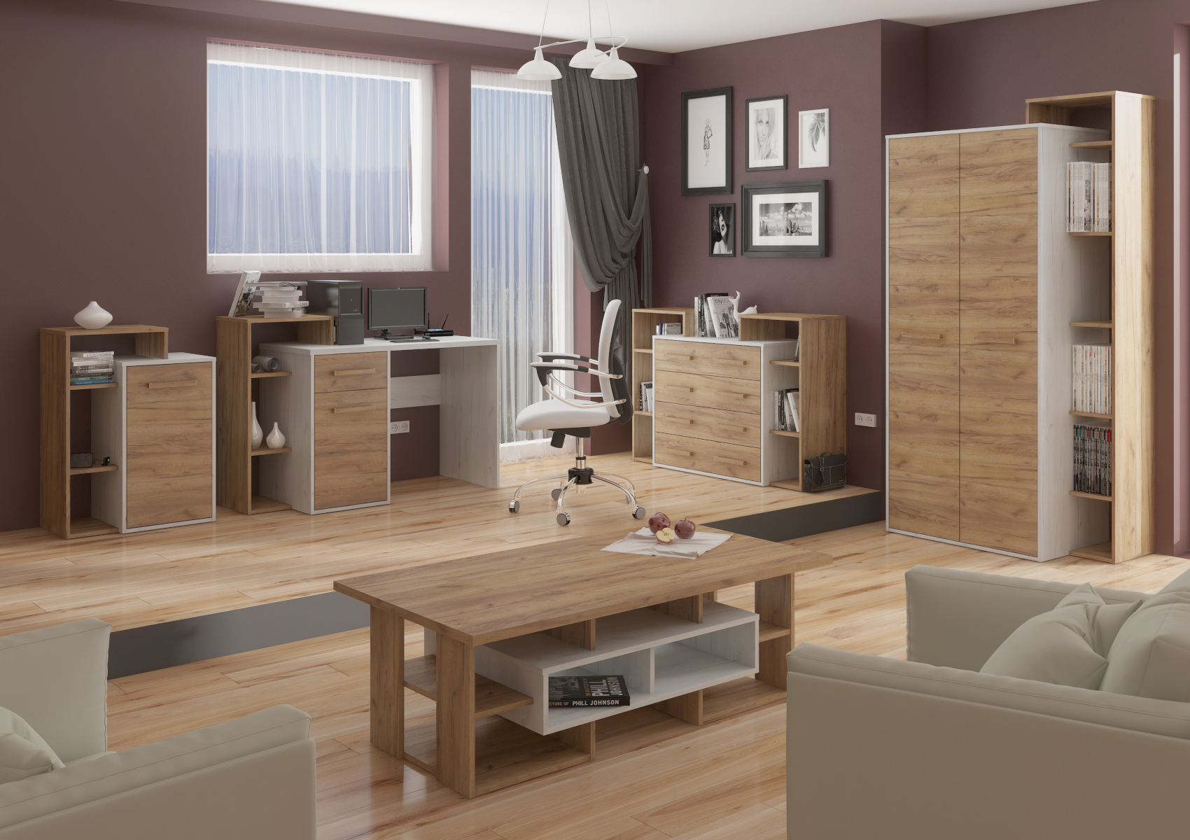Pracovna Rio 6 se skládá z - PC stůl L Rio 03, komoda 4S Rio 07, komoda L1D Rio 08, skříň P2D Rio 24.