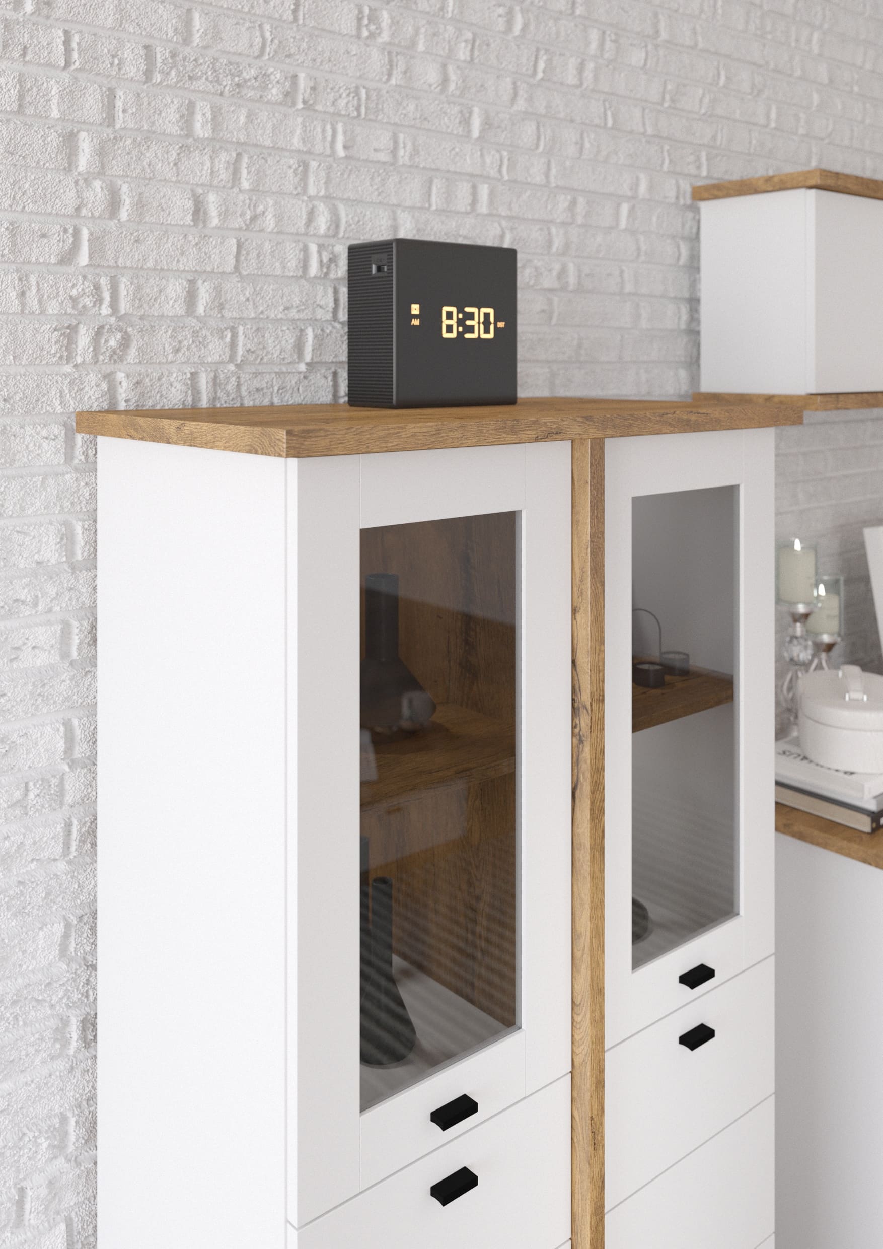 Vitríny mají kouřová skla, která ještě více zdůrazní originální vzhled systému. Černou barvou vynikají i úchyty, jež doplňují barevné kombinace reflektující moderní trendy v bydlení. S kolekcí Cross nemůžete šlápnout vedle!
