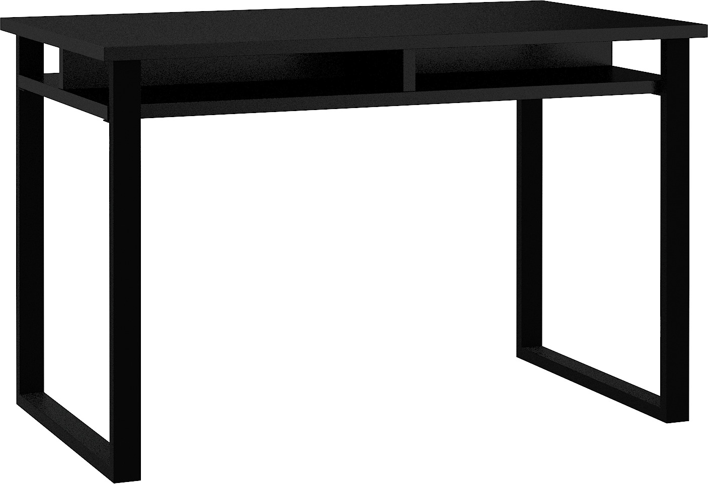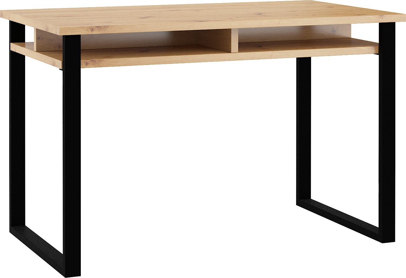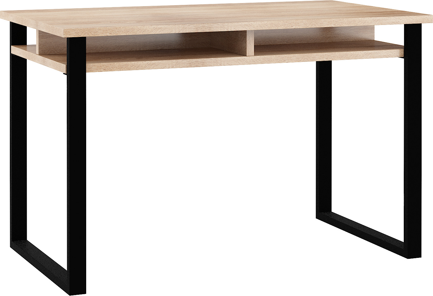 Psací stůl má odkládací prostory a kovové nožky vysoké 73 cm.