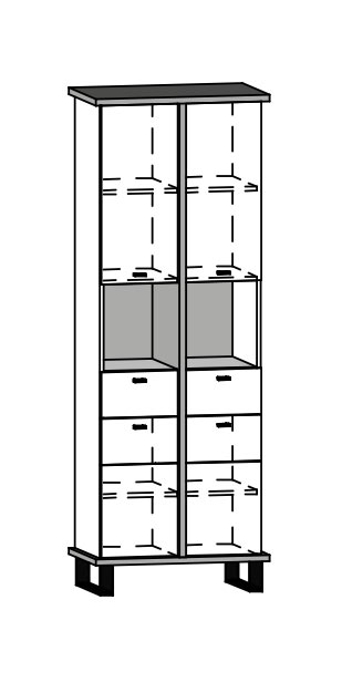 Vitríny mají kouřová skla, která ještě více zdůrazní originální vzhled systému. Černou barvou vynikají i úchyty, jež doplňují barevné kombinace reflektující moderní trendy v bydlení. S kolekcí Cross nemůžete šlápnout vedle!