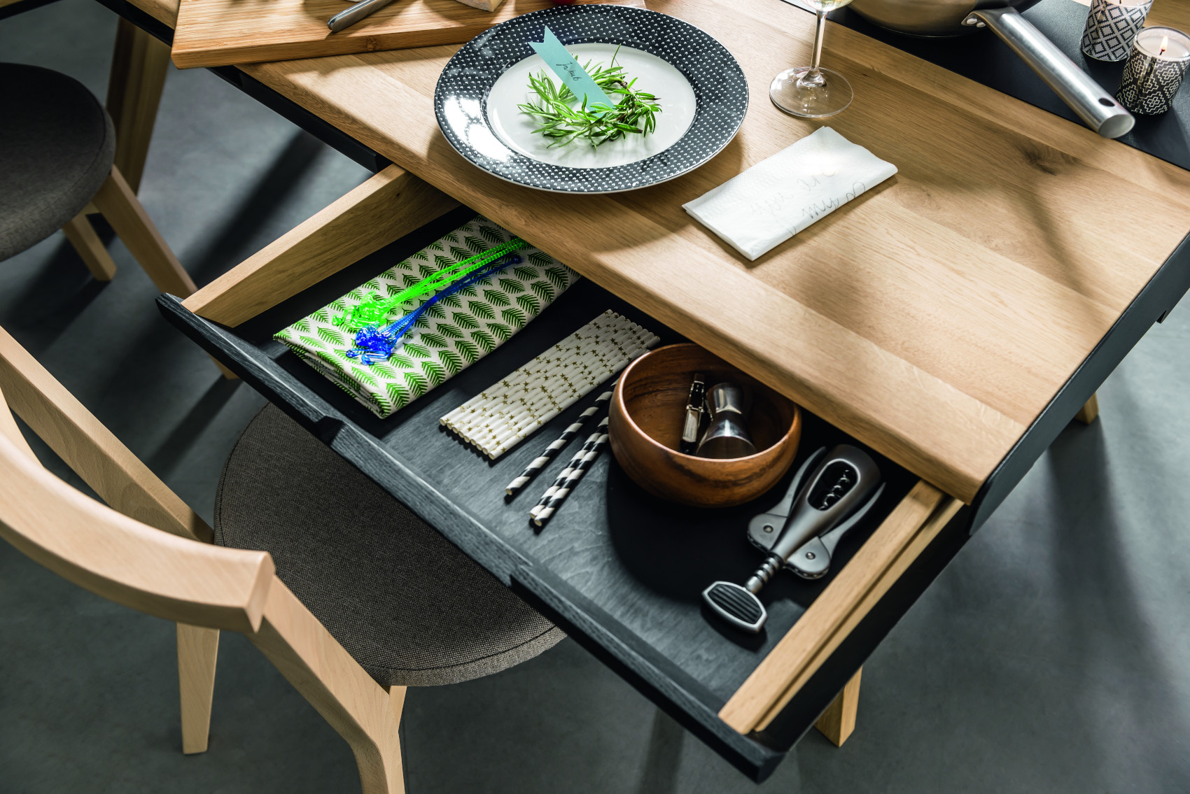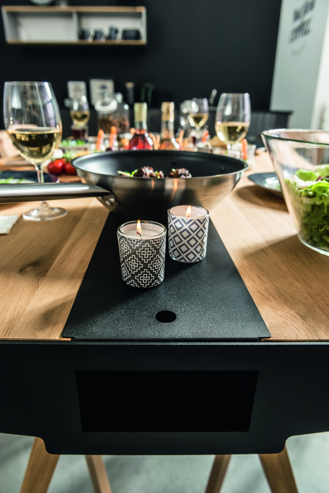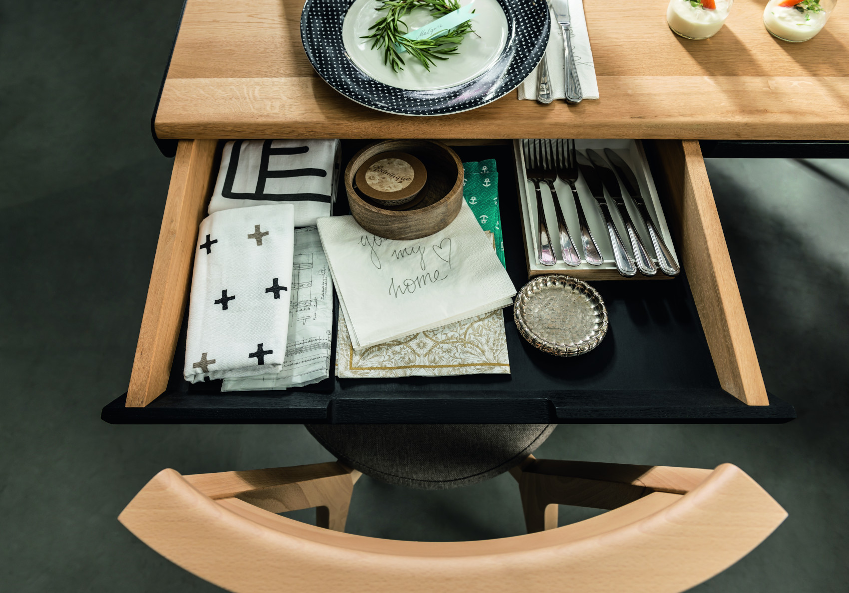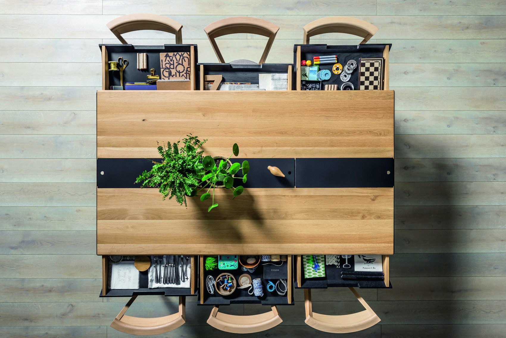 Součástí stolu je 6 zásuvek na kovových pojezdech, které slouží k uložení servírovacích potřeb. Uprostřed stolu je úložný prostor, kde si můžete vystavit své oblíbené bylinky, květiny nebo jiné dekorace. Prostor můžete zakrýt kovovými kryty, na které lze položit horké předměty.