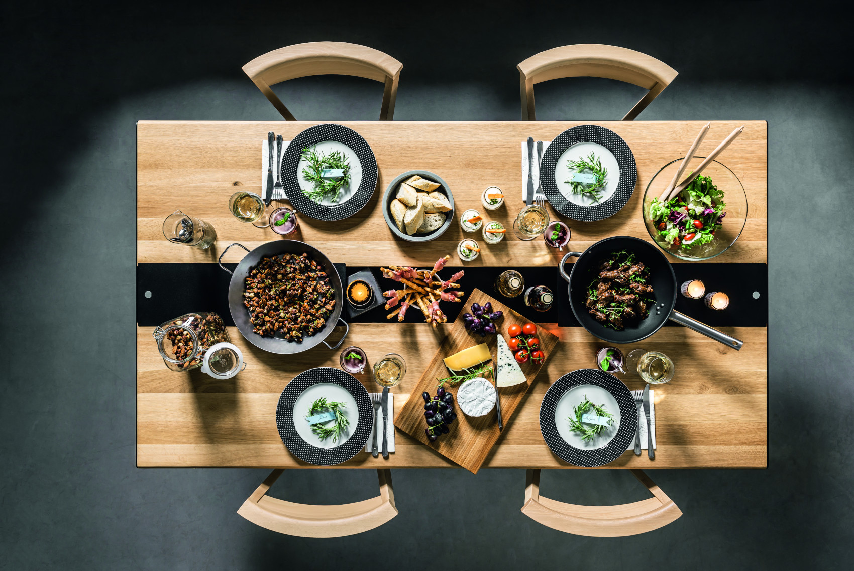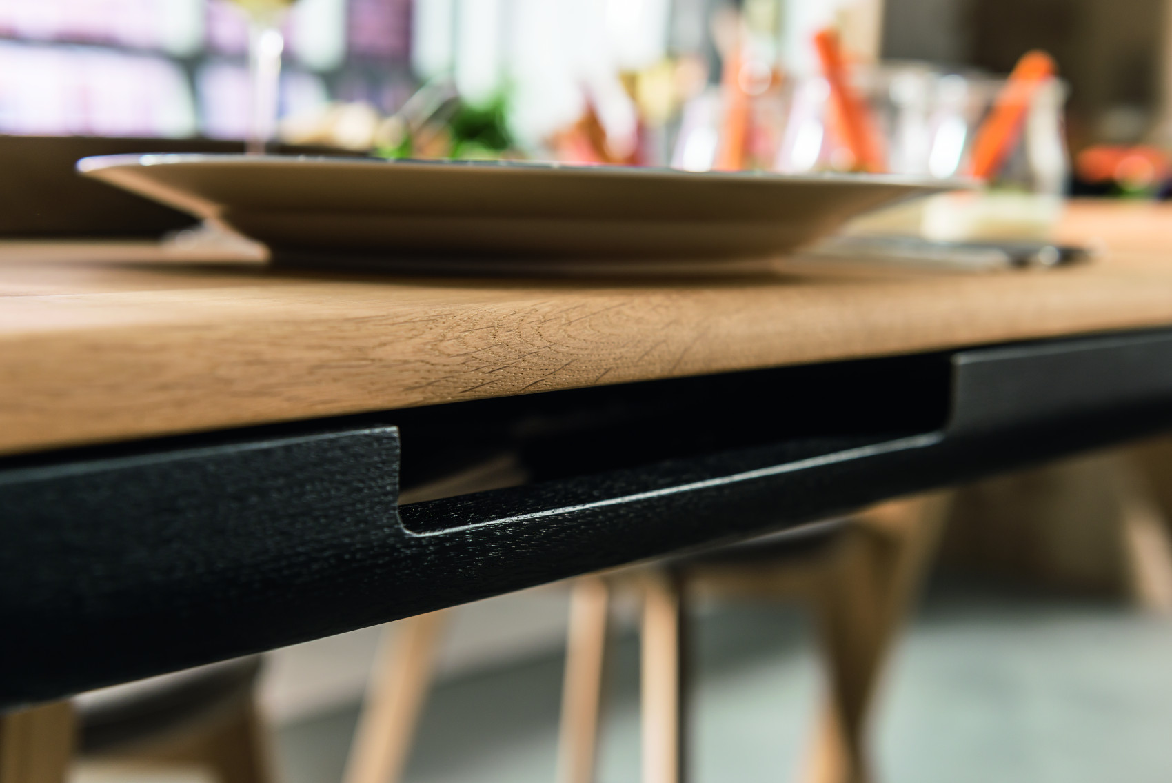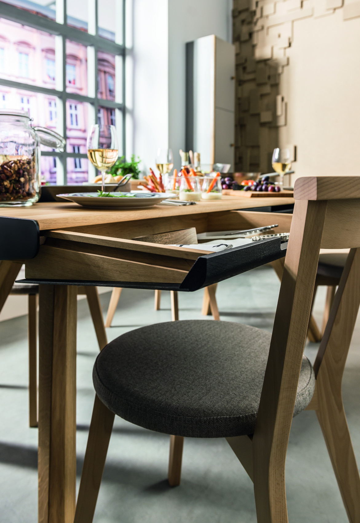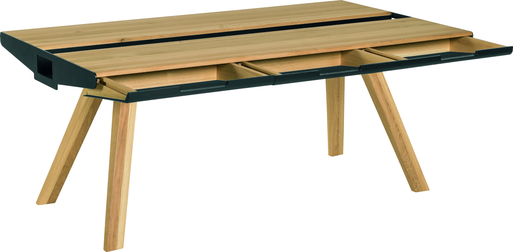Součástí stolu je 6 zásuvek na kovových pojezdech, které slouží k uložení servírovacích potřeb. Uprostřed stolu je úložný prostor, kde si můžete vystavit své oblíbené bylinky, květiny nebo jiné dekorace. Prostor můžete zakrýt kovovými kryty, na které lze položit horké předměty.