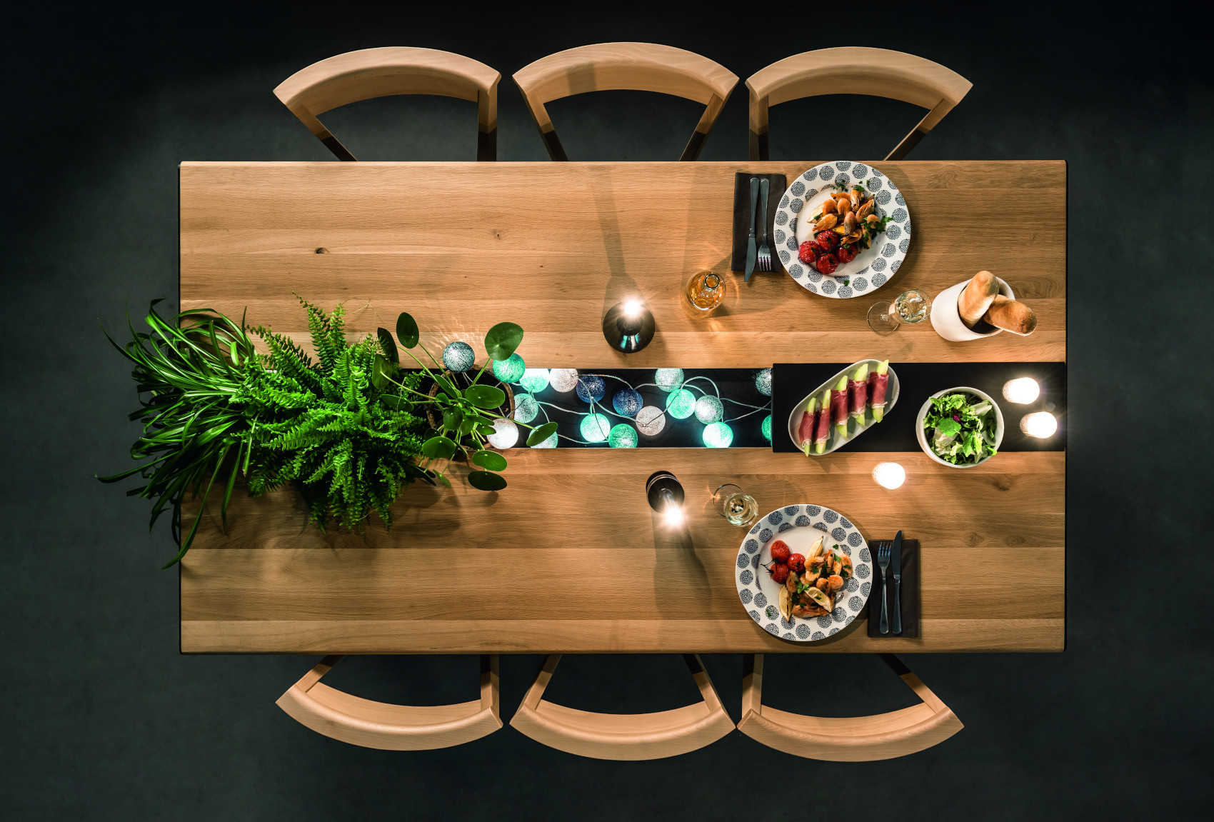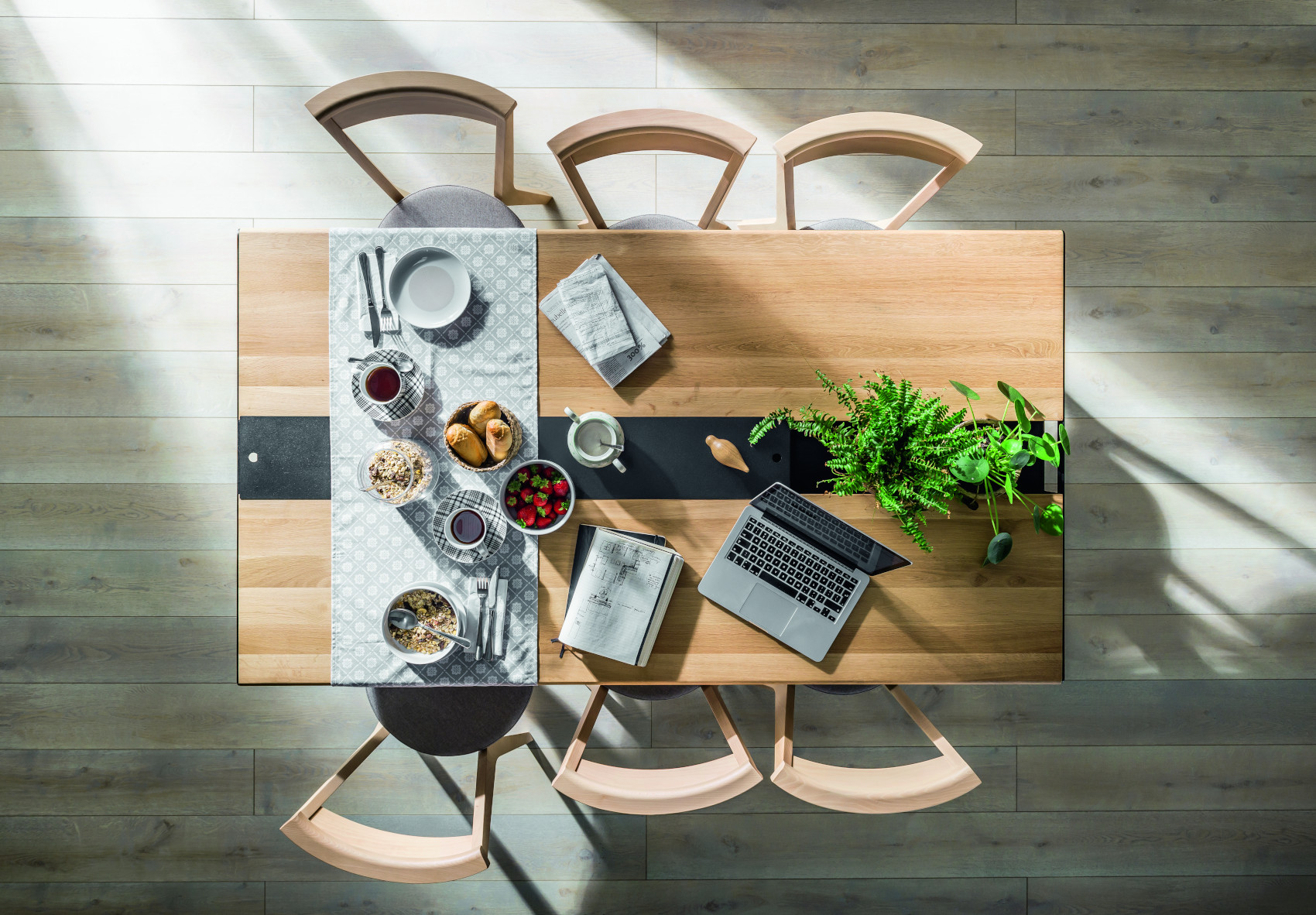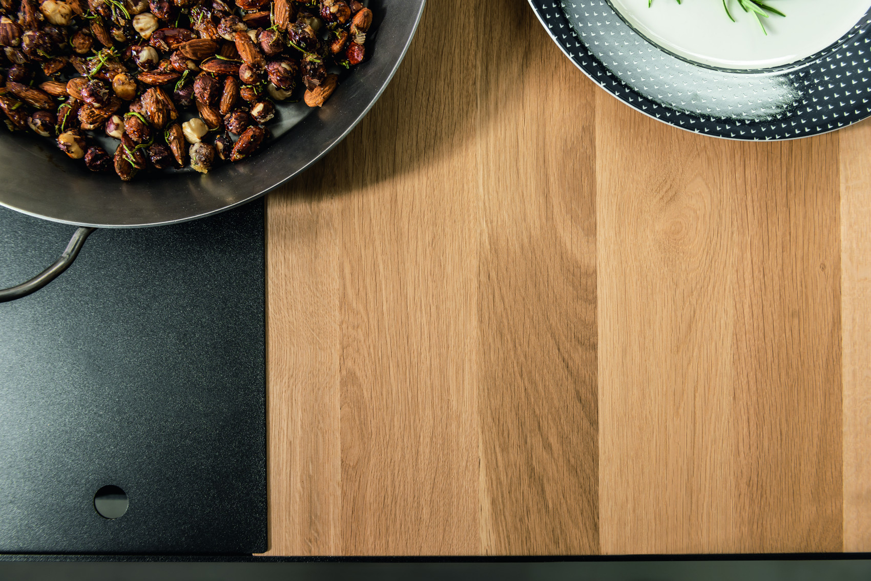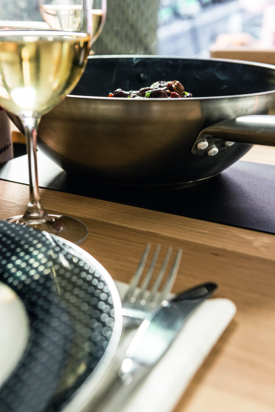 Součástí stolu je 6 zásuvek na kovových pojezdech, které slouží k uložení servírovacích potřeb. Uprostřed stolu je úložný prostor, kde si můžete vystavit své oblíbené bylinky, květiny nebo jiné dekorace. Prostor můžete zakrýt kovovými kryty, na které lze položit horké předměty.