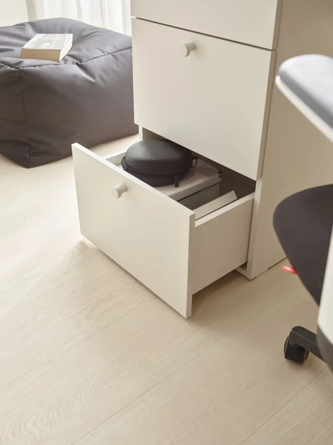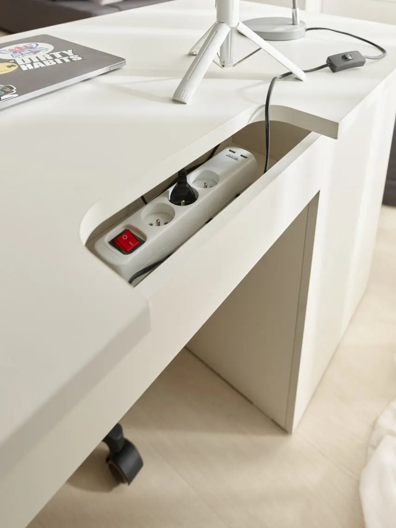 Součástí jsou 3 zásuvky na kovových pojezdech, které mají zabudovaný systém tichého dovírání. V zadní části stolu je výřez k usnadnění přístupu k zásuvkám a uspořádání různých kabelů.