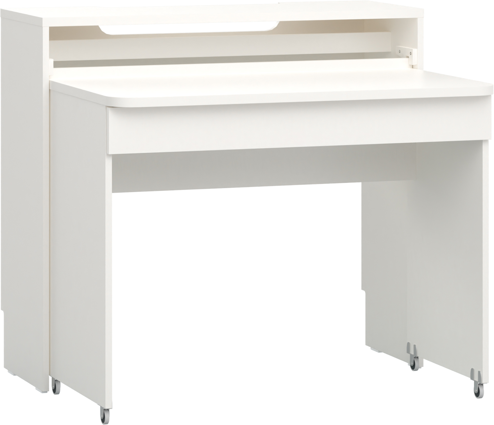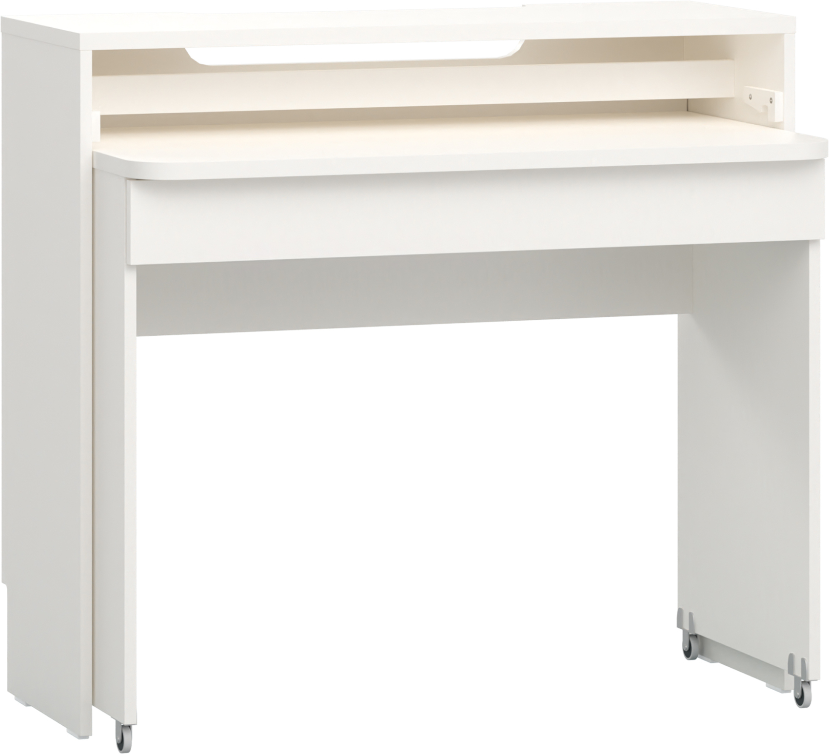 Vysouvací psací stůl Reli vás zaujme svým jednoduchým designem s moderními prvky v alabastrově bílém odstínu. Je vyroben z kvalitního lamina o síle 16 mm a 22 mm, která vám zaručí odolnost vůči poškození. K vysouvací části stolu jsou připevněna kolečka z odolného kovu a plastu.