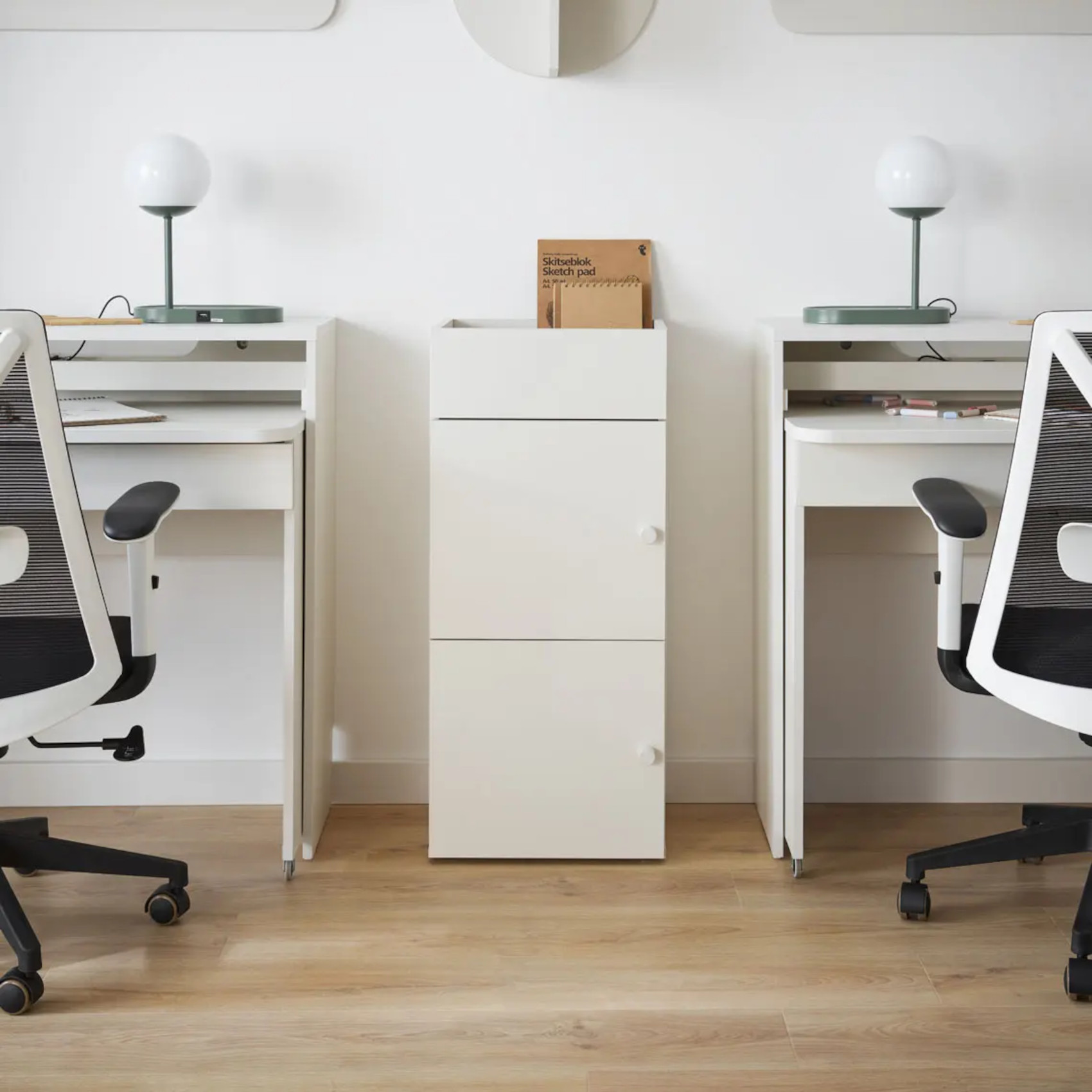 Skříňka k psacímu stolu Reli vás zaujme svým jednoduchým designem s moderními prvky v alabastrově bílém odstínu. Je vyrobena z kvalitního lamina o síle 16 mm, která vám zaručí odolnost vůči poškození. Úchyty jsou z přírodního bukového dřeva. Dvířka mají zabudovaný systém tichého dovíraní.