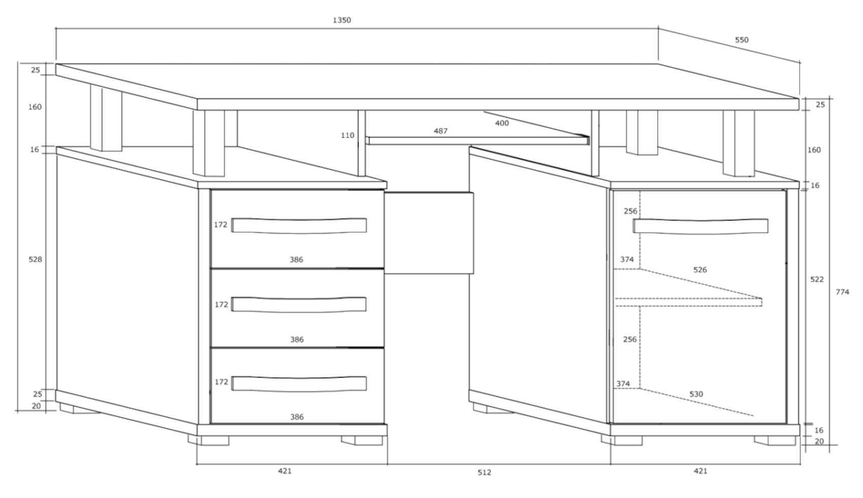 Součástí jsou 1 plná dvířka, za kterými je vložena 1 lakovaná police a 3 zásuvky na kovových pojezdech. V horní části jsou 2 otevřené niky a pojízdná police k odložení vašich nezbytností.