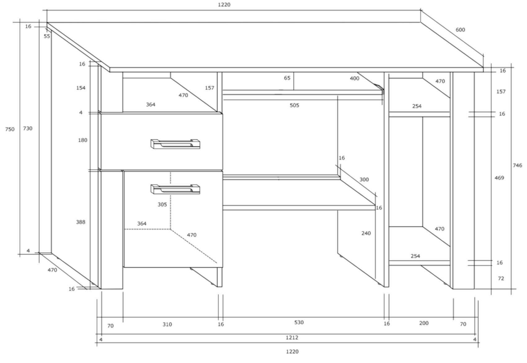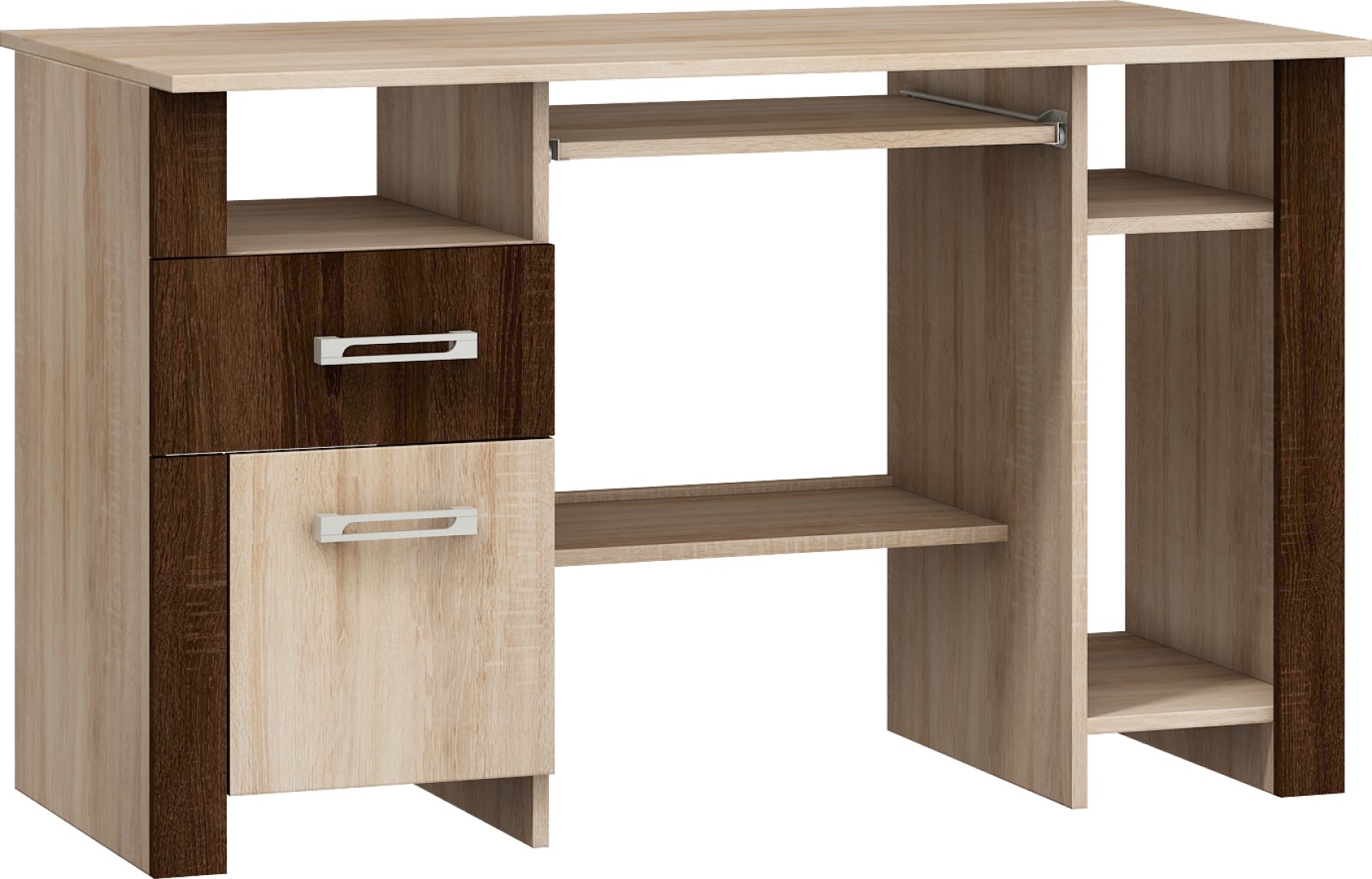 Součástí jsou 1 dvířka a 1 zásuvka na kovových pojezdech. Pod horní deskou je vysouvací deska k uložení PC klávesnice či jiných nezbytností.