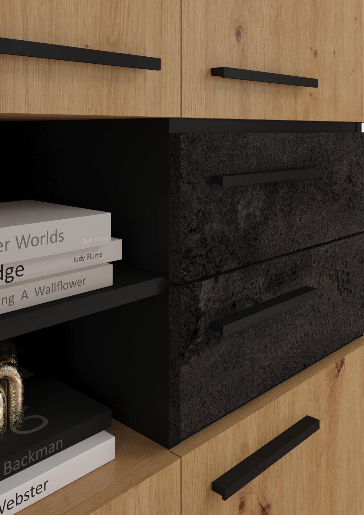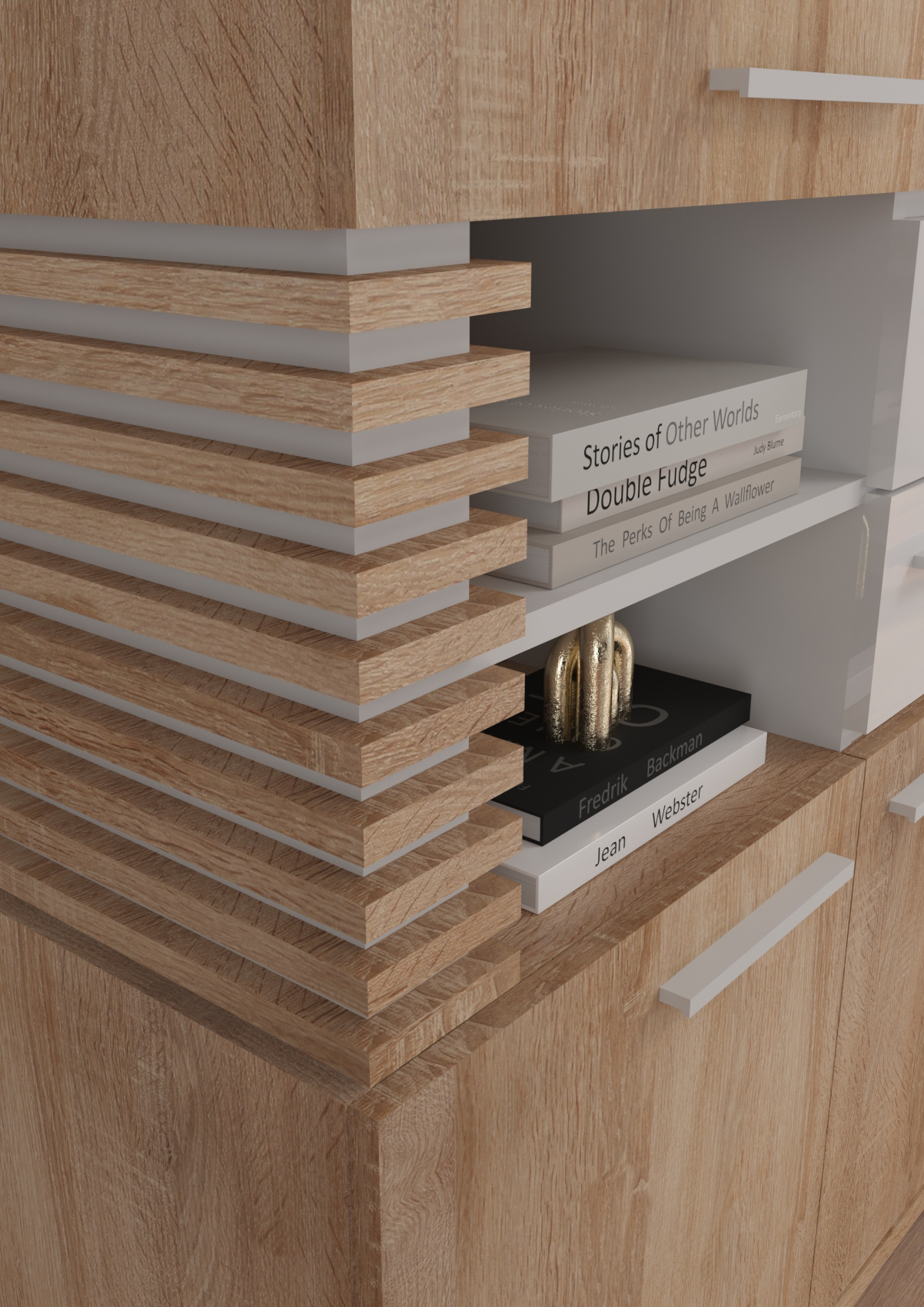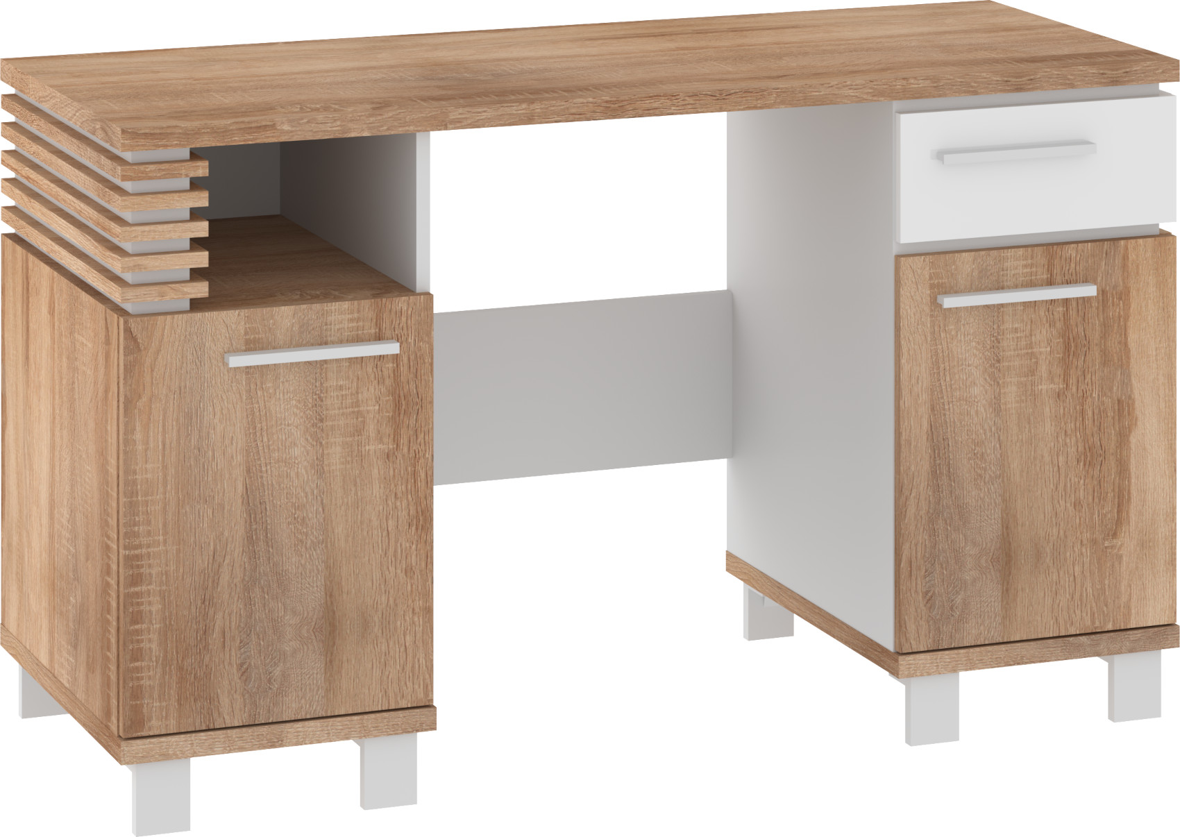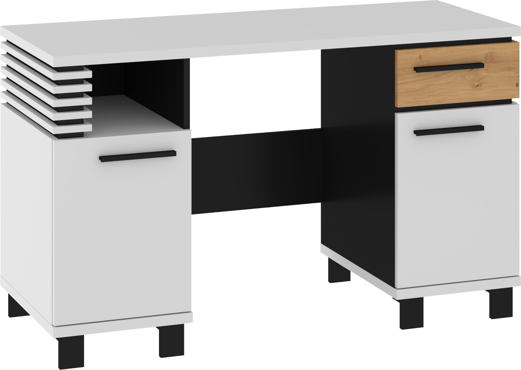 Součástí stolu jsou 2 dvířka s 2 lakovanými policemi a 1 zásuvka na kovových pojezdech. Nad levými dvířky je otevřená nika k uložení vašich nezbytností.