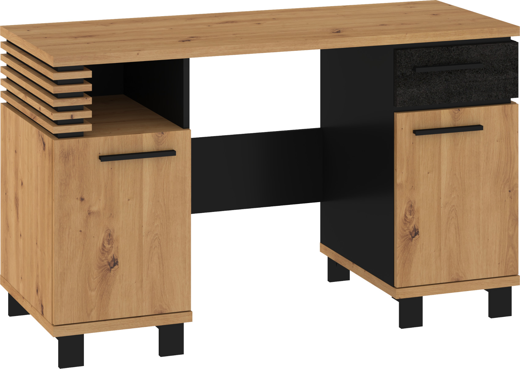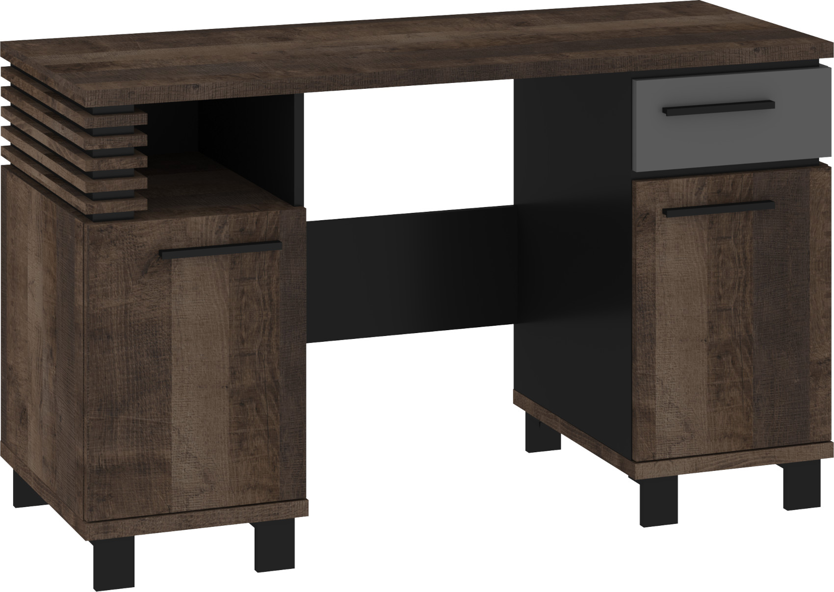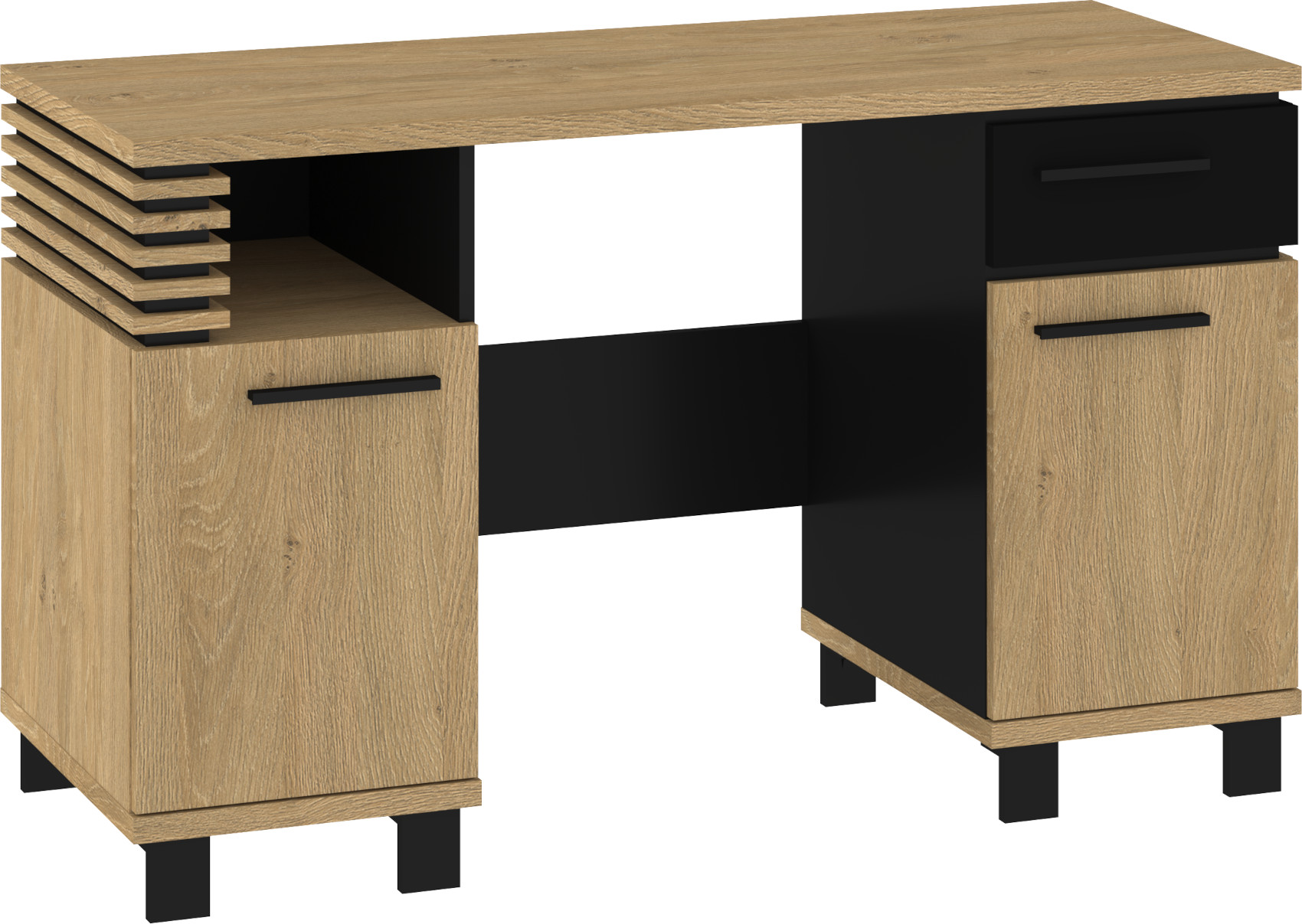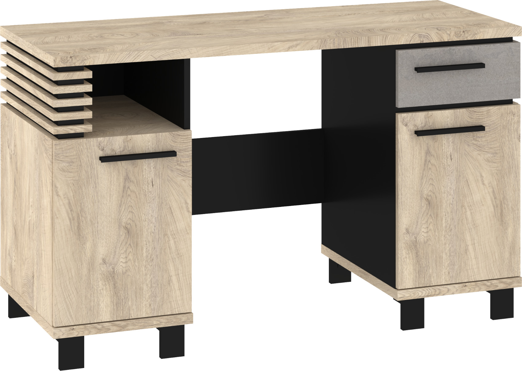 Psací stůl Lamir vás zaujme svým moderním elegantním designem s luxusními přírodními detaily. Je vyroben z kvalitních lamino desek o síle 16 mm a 25 mm. Desky mají ABS hranění, které zvyšuje odolnost pro odštípnutí hran. Součástí zásuvek a dvířek jsou jednoduché kovové úchyty a zároveň mají zabudovaný systém tichého dovírání. Nábytek stojí na 8 cm nožkách, které provzdušní váš interiér. Nabízíme vám několik barevných variant.