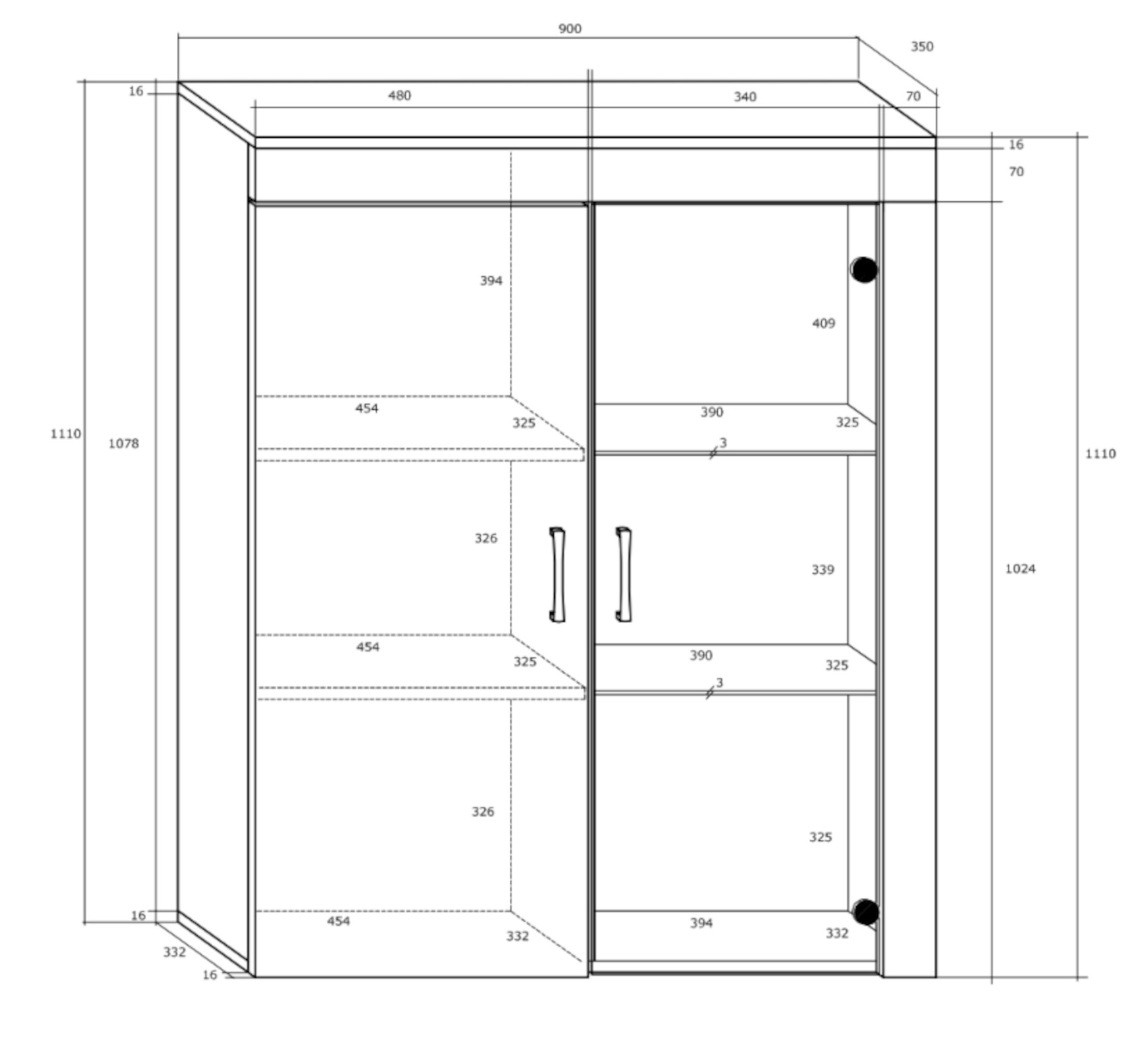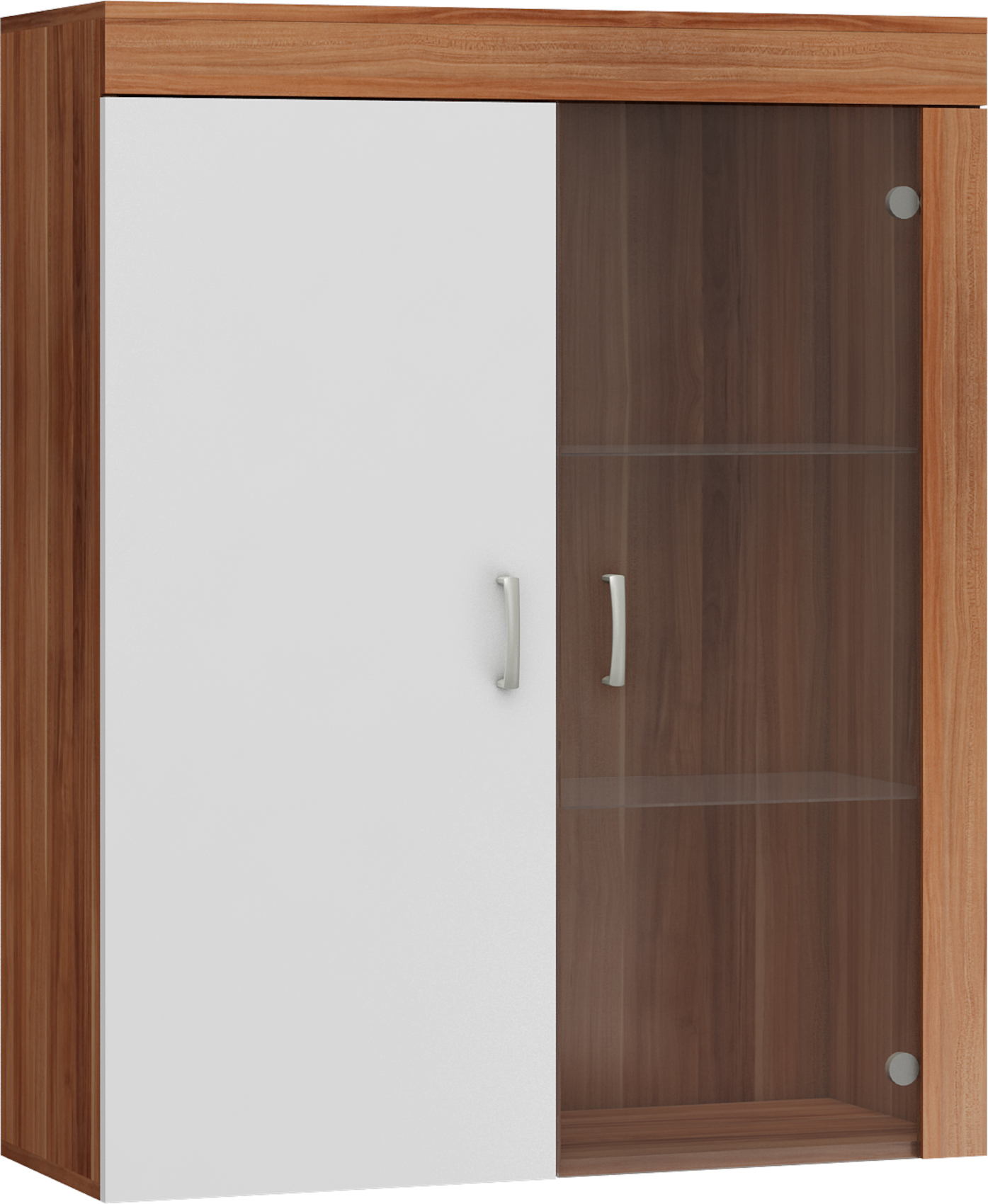 Součástí skříňky jsou 2 dvířka, z nichž pravá jsou prosklená. Za nimi jsou vloženy 2 lakované a 2 prosklené police.