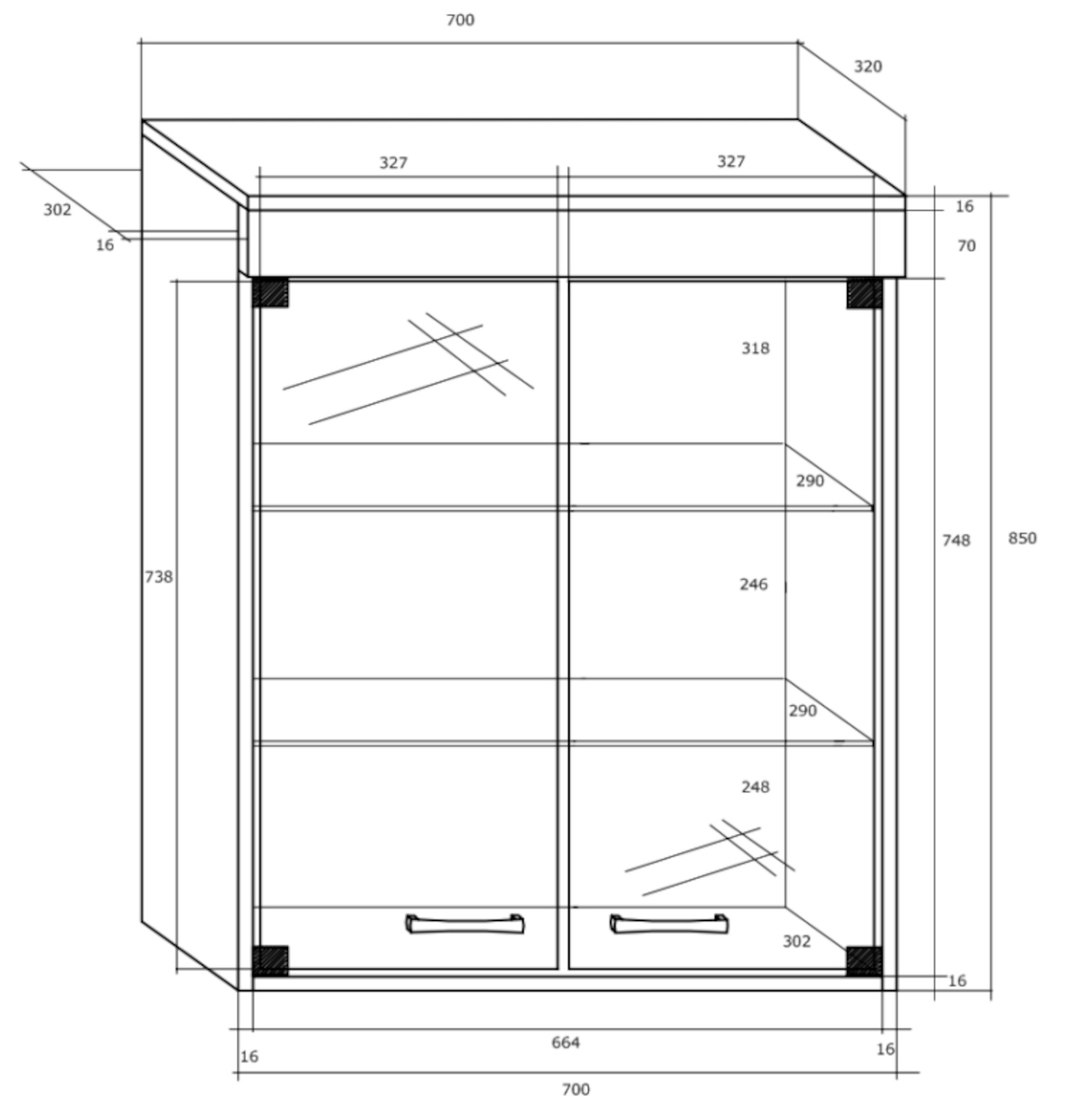 Součástí skříňky jsou 2 prosklená dvířka, za kterými jsou vloženy 2 skleněné police.