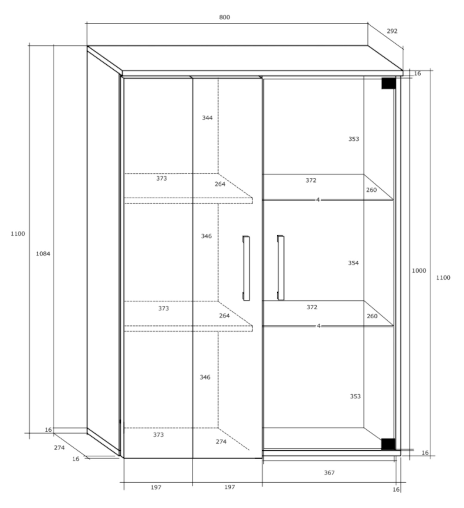 Součástí komody jsou 1 plná a 1 prosklená dvířka. Za nimi jsou vloženy 2 lakované a 2 skleněné police.