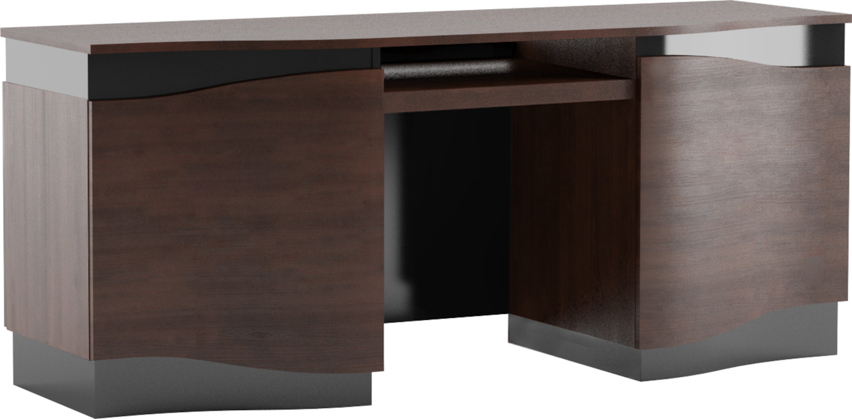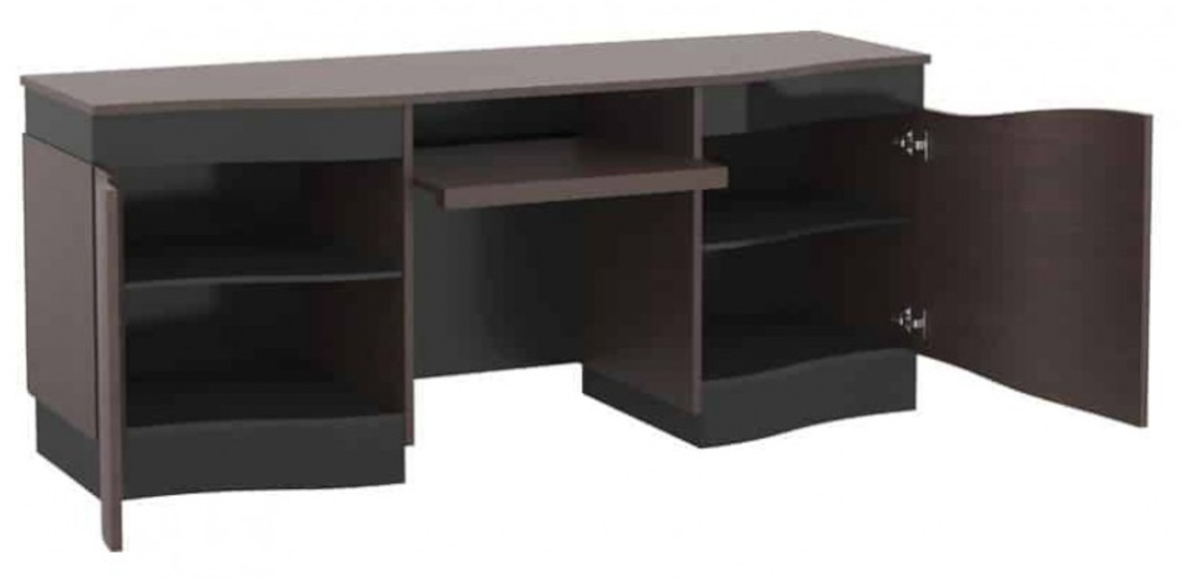 Psací stůl má po stranách 2 plná dřevěná dvířka, za kterými jsou vloženy 2 lakované police. Mezi dvířky, pod horní deskou, je pojízdná deska k uložení počítačové klávesnice nebo jiné elektroniky.