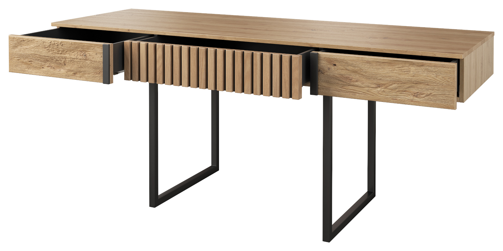 Moderní psací stůl Gintaro 3SZ velký vás zaujme svým jedinečným designem. Černé lamely na přední straně nábytku dodají nádech elegance a kovové a neobyčejně tvarované nohy provzdušní váš interiér. Stůl je vyroben z masivního dubového dřeva a přírodní dubové dýhy. Kvalitní technologie lakování a moření navodí přírodní vzhled dřeva a zvýrazní tak jeho léta. Dvířka i zásuvky v celém systému mají tichý jednoduchý dotykový systém otevírání a zavírání - Push to open.