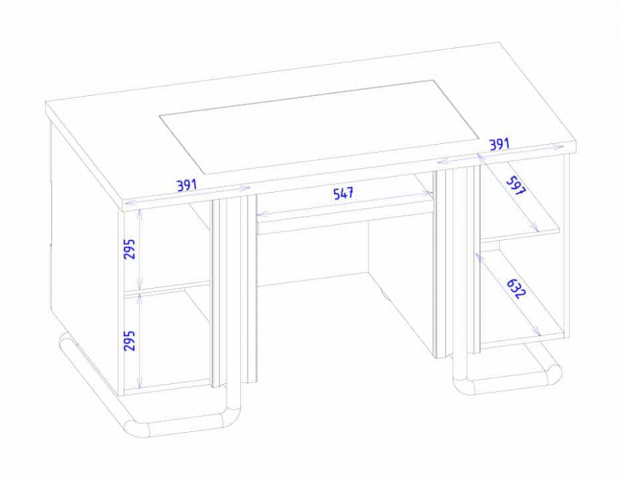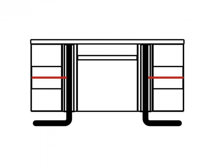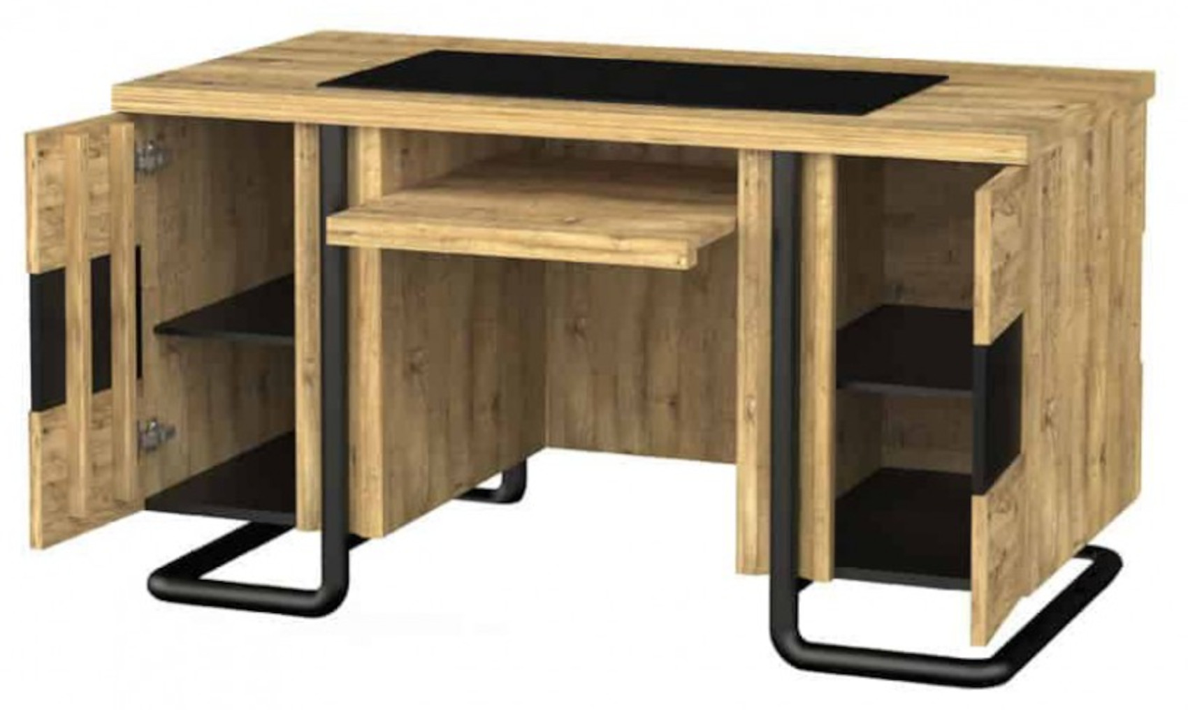 Stůl má po stranách 2 plná dvířka za kterými jsou vloženy 2 lakované police. Pod horní pracovní deskou je pojízdná deska na kovových pojezdech k uložení klávesnice nebo jiné elektroniky.