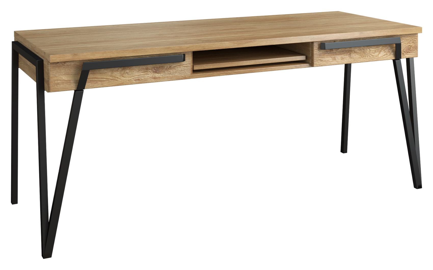 Psací stůl Pik vás zaujme svým moderním a jednoduchým designem. Přední část nábytku je vyrobena z masivního dubového dřeva a korpus je z přírodní dubové dýhy. Kvalitní technologie lakování a moření dodává nábytku přirozený vzhled dřeva a zvýrazňuje strukturu lét. Jeho atypickými prvky jsou kovové práškově lakované nožky, které provzdušní celý prostor. Zásuvky mají tiché dovírání.