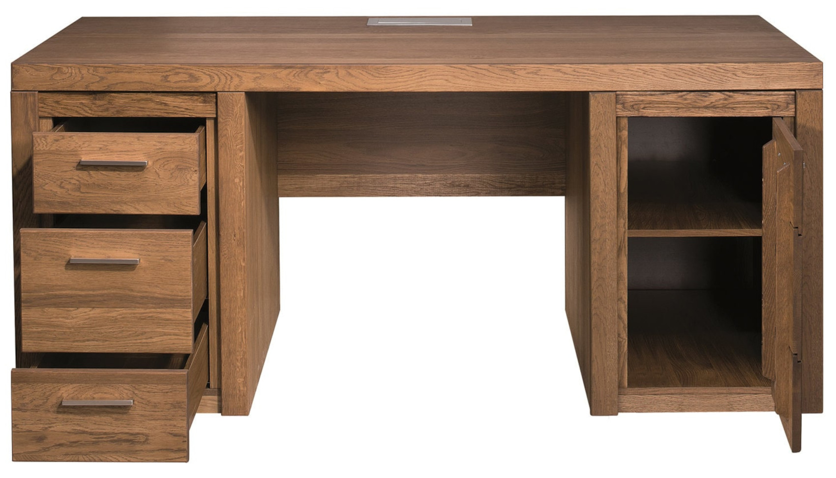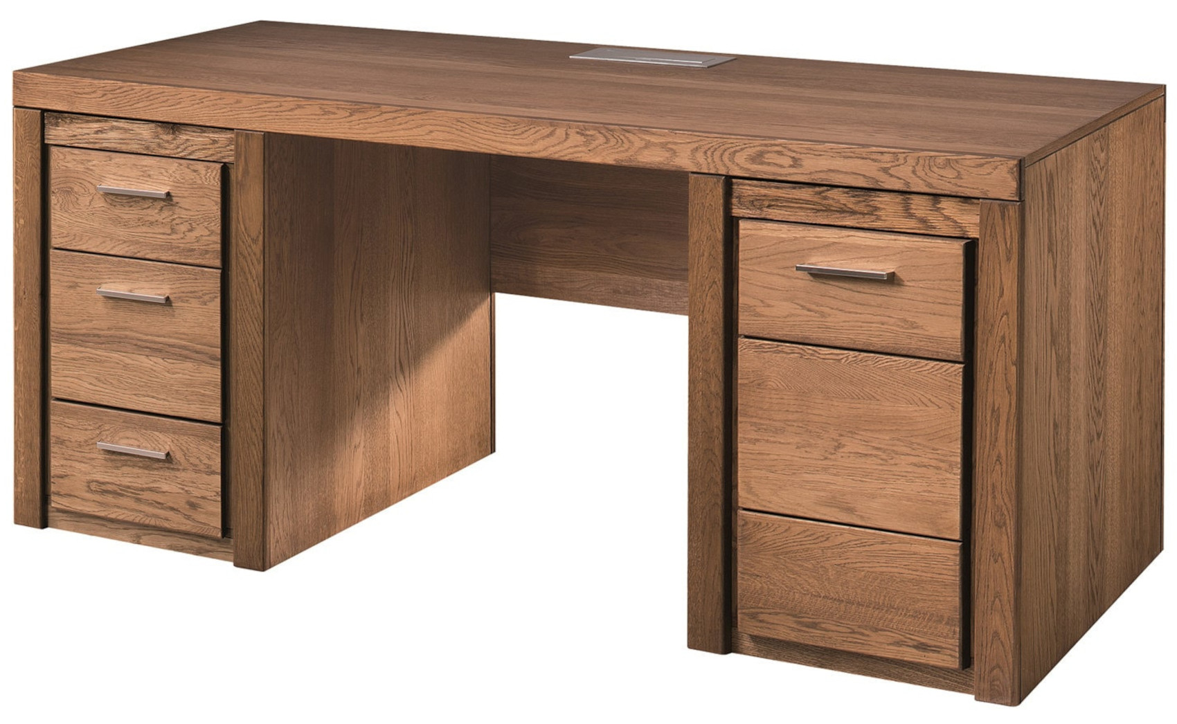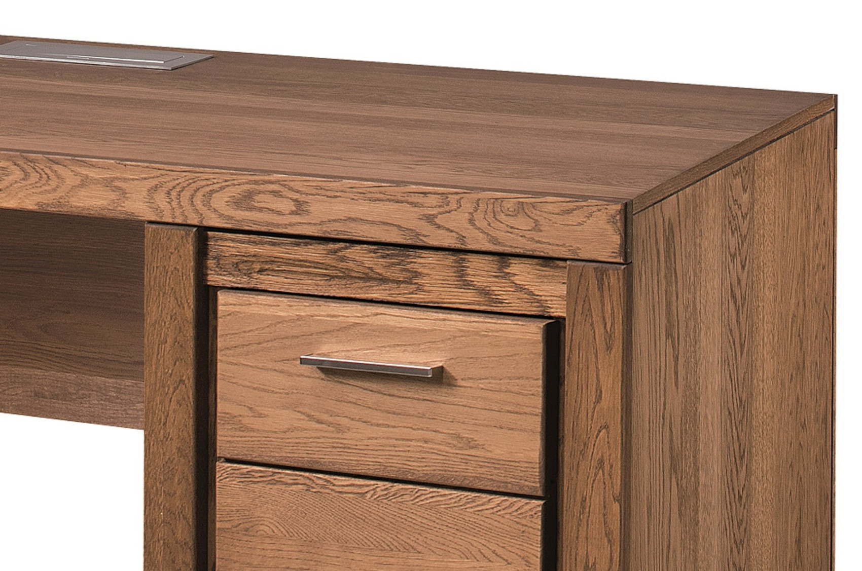 Moderní psací stůl Velvet 37 vás zaujme svým elegantním a přírodním designem s viditelnou strukturou dřevěných lét. Přední části stolu jsou vyrobeny z masivního dubového dřeva a korpus z přírodní dubové dýhy. Veškerá dvířka i zásuvky mají kovové úchyty.